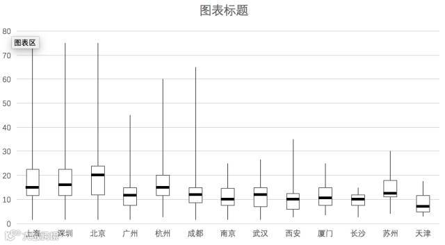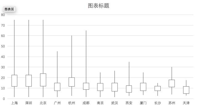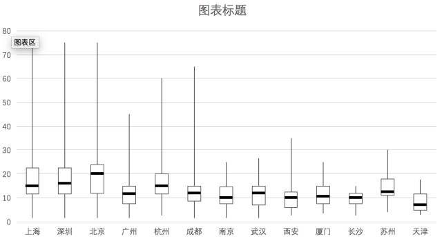 其实从图表中看到,虽然我们描绘出了箱线图,但是不同城市的数据区别并不直观,因为最大值撑高了箱线图的边缘。我们经常会遇到这些影响分析质量的异常值(过于异常的数值虽然存在合理性,但是很多分析必须移除掉它们)。我们需要清洗掉这批异常值。