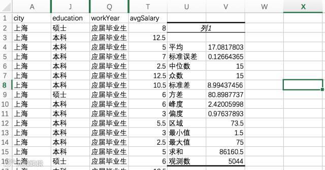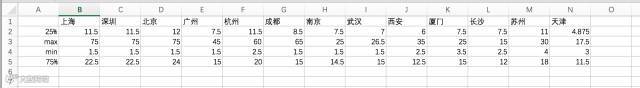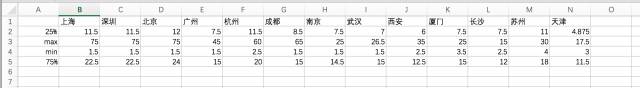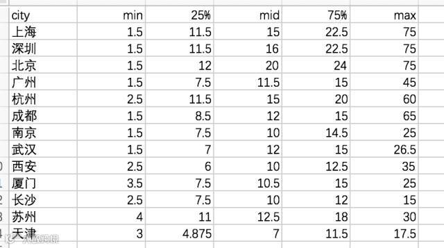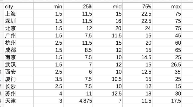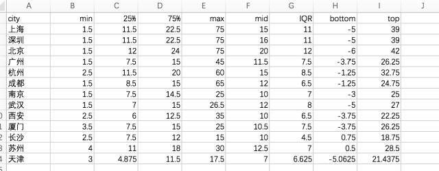 以上是清洗后的数据。我们用Excel函数计算这五个度量。分别是median( )、max( )、min( )、quartile( )。按城市区分。