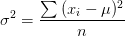 上述公式是总体数据集的方差计算,当数据近为部分抽样样本时,n应该改为n-1。数据集足够大时,两者的误差也可以忽略不计。