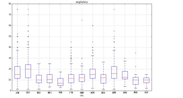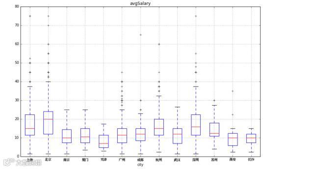 通过数据,现在可以了解各城市的数据分析师薪资分布了,接下来把它们加工成箱线图,它是最常用的描述统计图表。