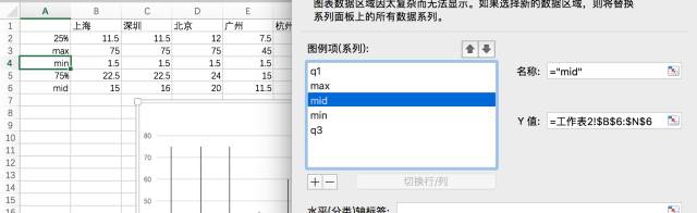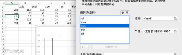 第一种,是利用股价图。将图表按25%分位数、最大值、最小值、75%分位数的顺序排列。