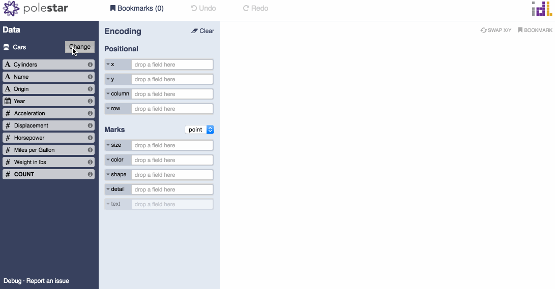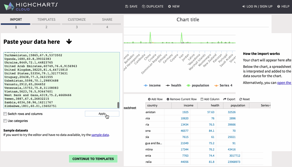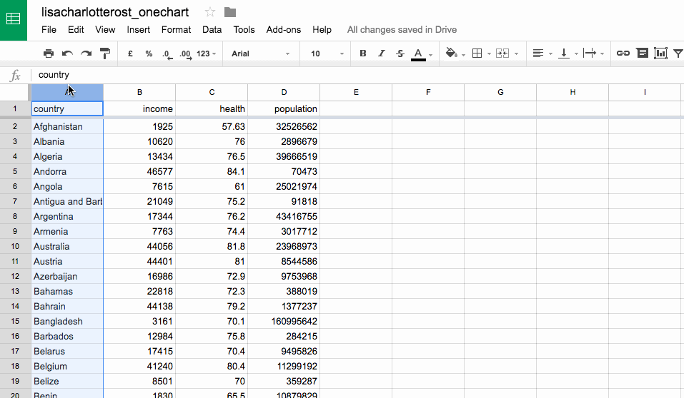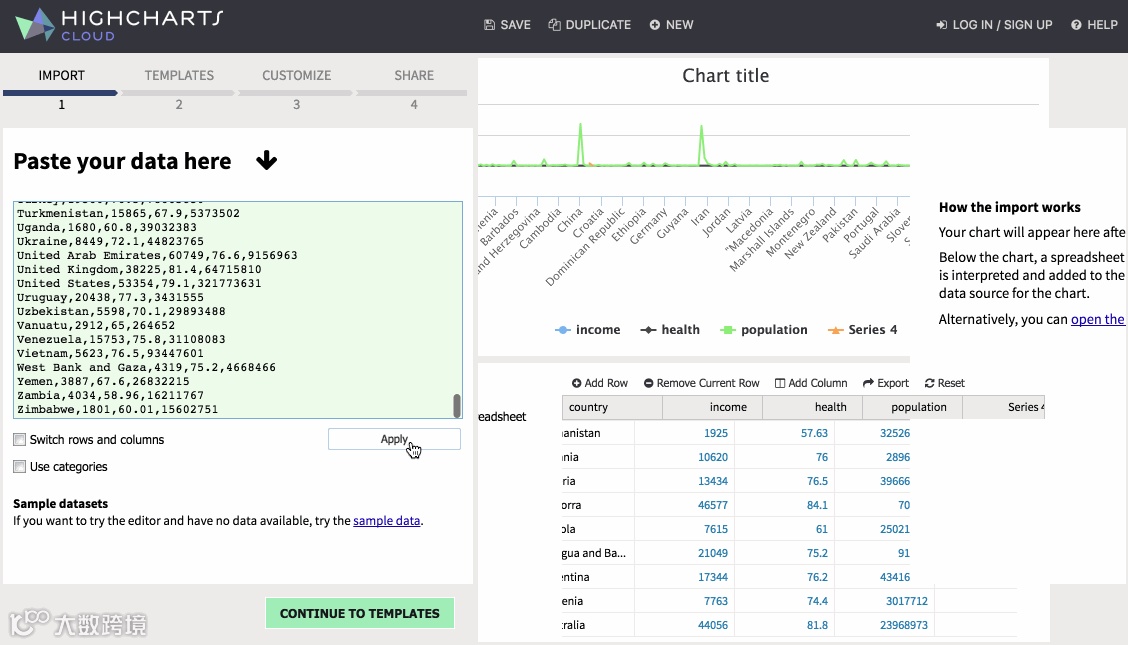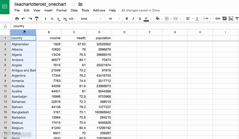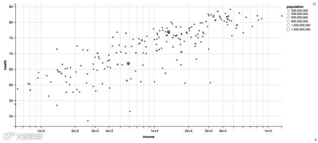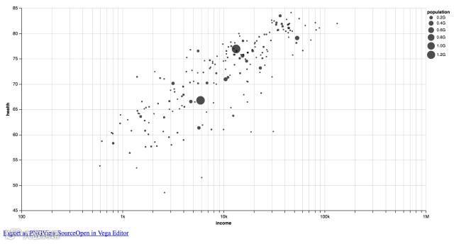 数据源统一如下,4个字段分别为国家,人均收入,寿命,人口总数,想要做的效果是一个气泡图,X轴为人均收入,Y轴为寿命,气泡大小为人口总数