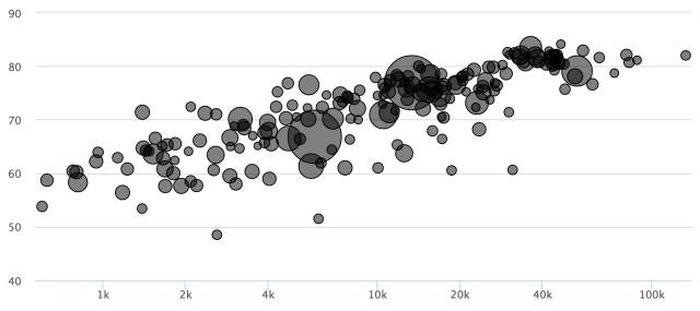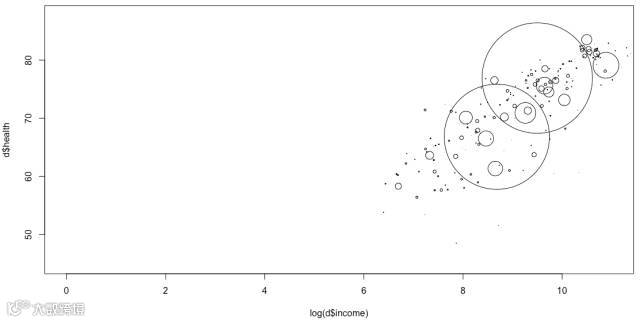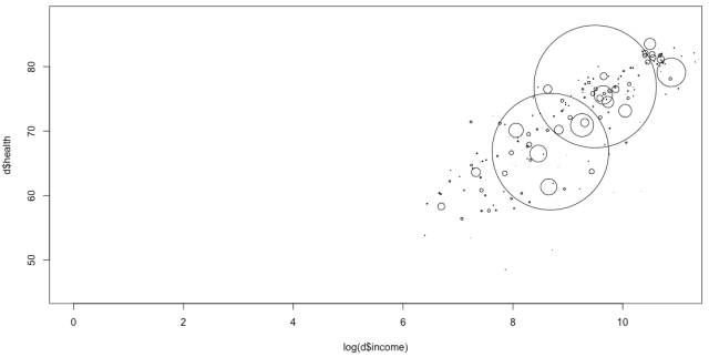 #set working directorysetwd("Desktop")#read csvd = read.csv("data.csv", header=TRUE)#plot chart, set range for x-axis between 0 and 11symbols(log(d$income),d$health,circles=d$population,xlim = c(0,11))