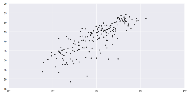#import librariesimport pandas as pdimport matplotlib.pyplot as pltimport seaborn as sns#read datadata = pd.read_csv("data.csv")#plot chartg = sns.regplot('income', 'health', data=data, color='k',fit_reg=False)g.set_xscale('log')plt.show()