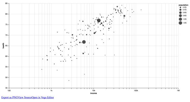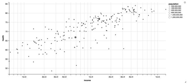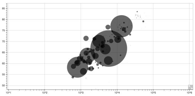 #import librariesimport pandas as pdfrom bokeh.plotting import figure, show, output_file#read datadata = pd.read_csv("data.csv")#plot chartp = figure(x_axis_type="log")p.scatter(data['income'], data['health'], radius=data['population']/100000,