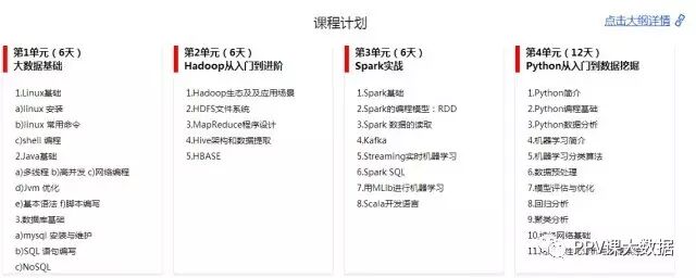 五大教学单元,超过200课时面授课程和100课时网络课程,让你在大数据平台、计算机编程、机器学习算法上全面的提升;