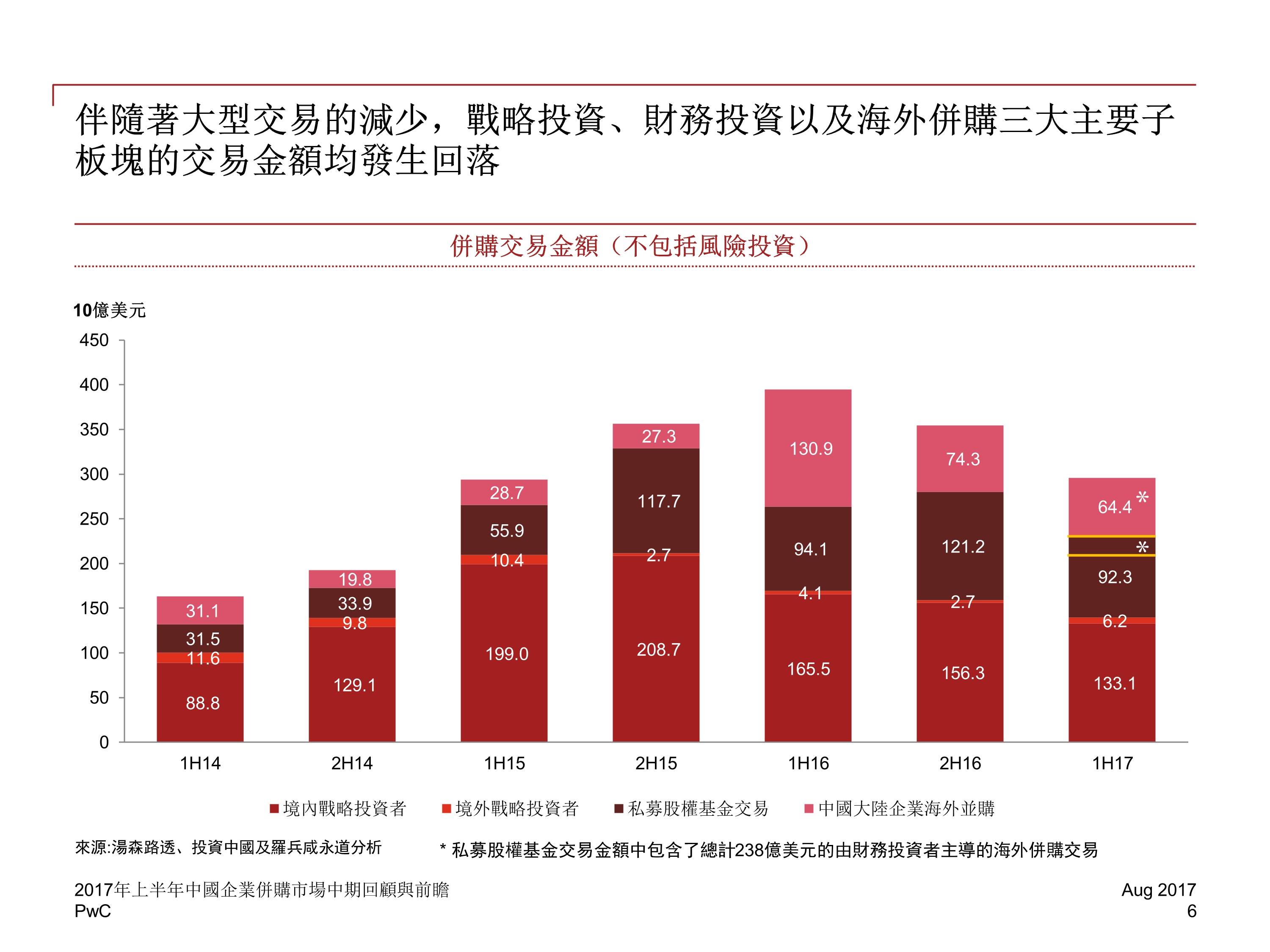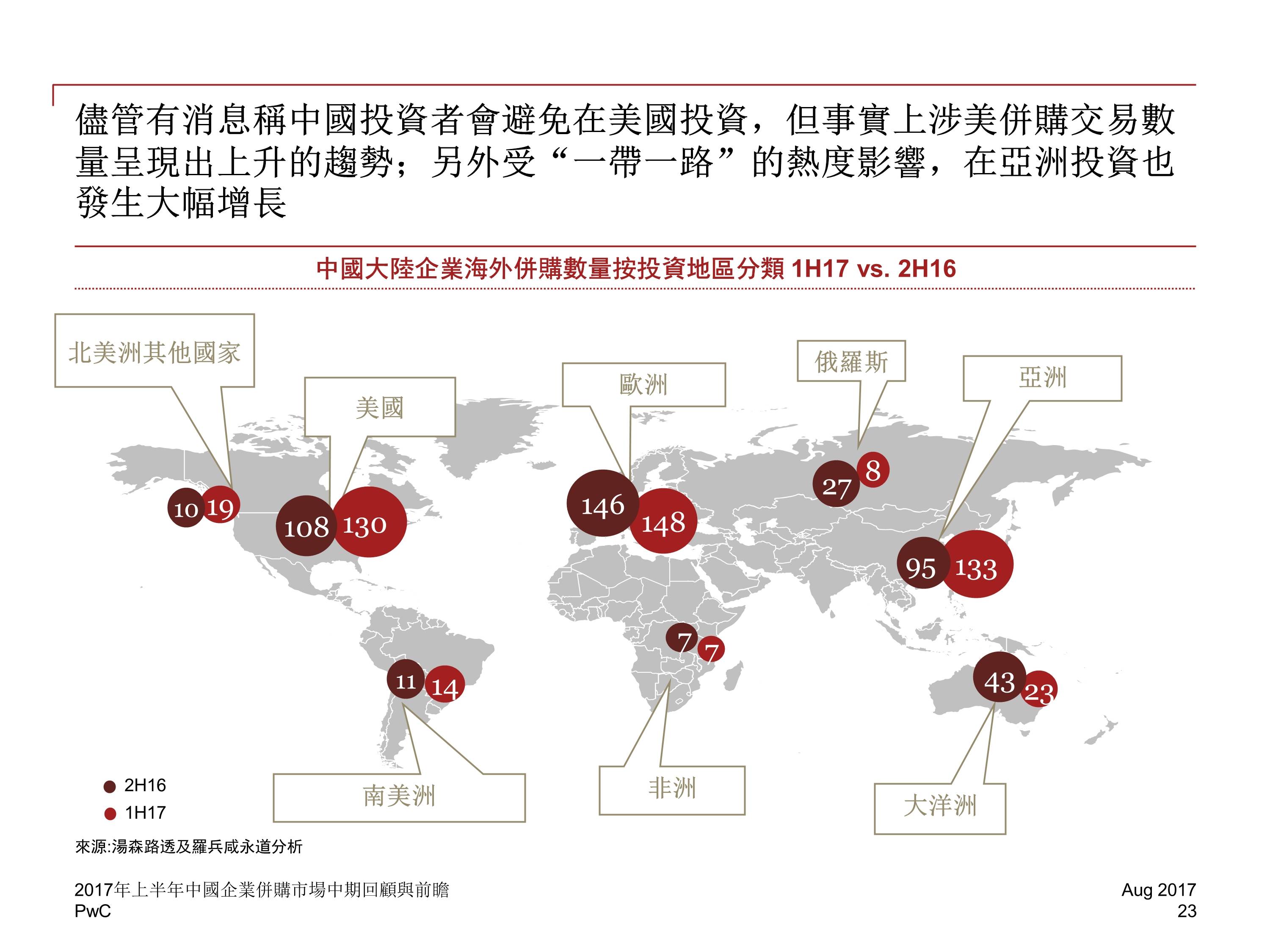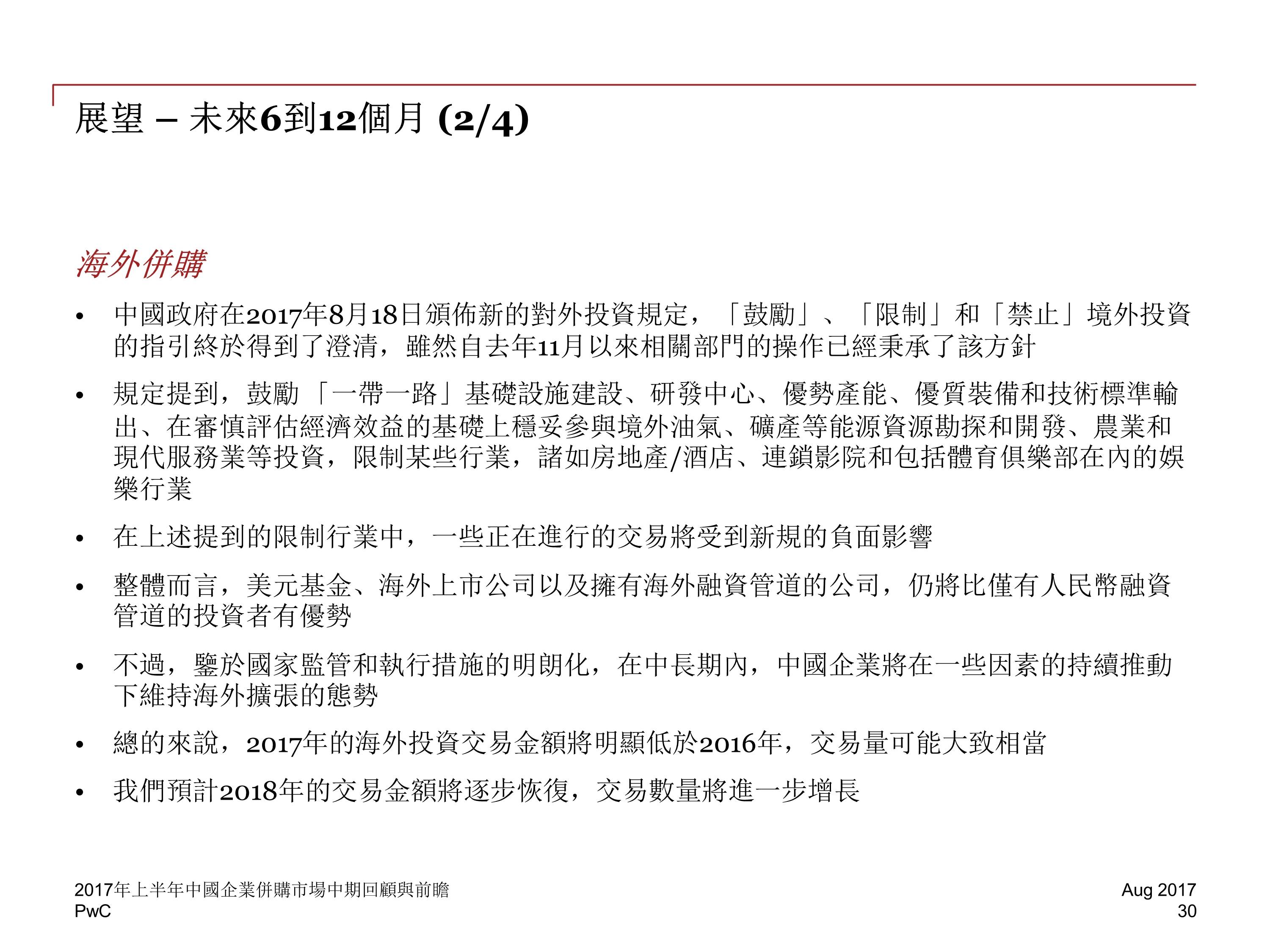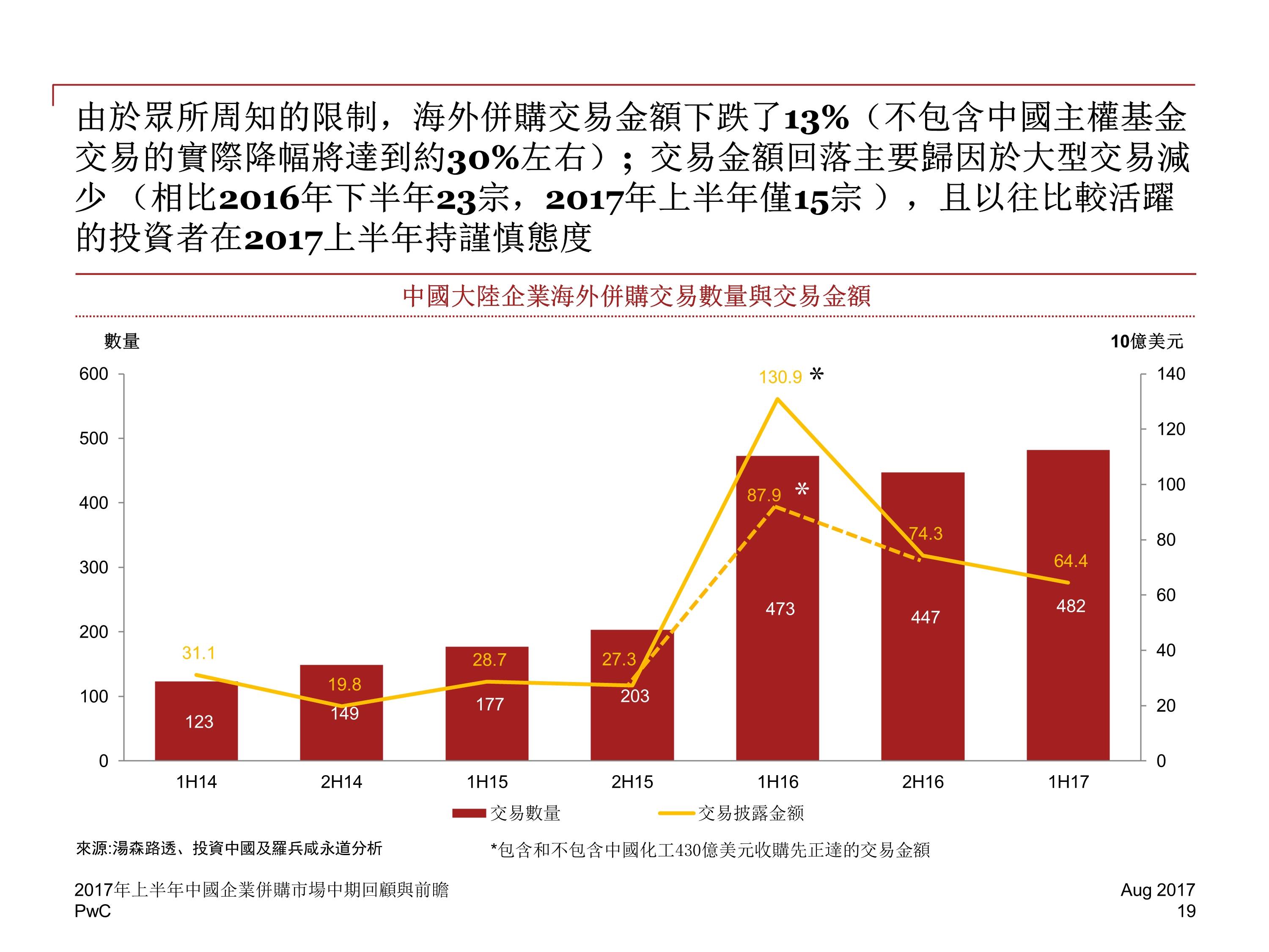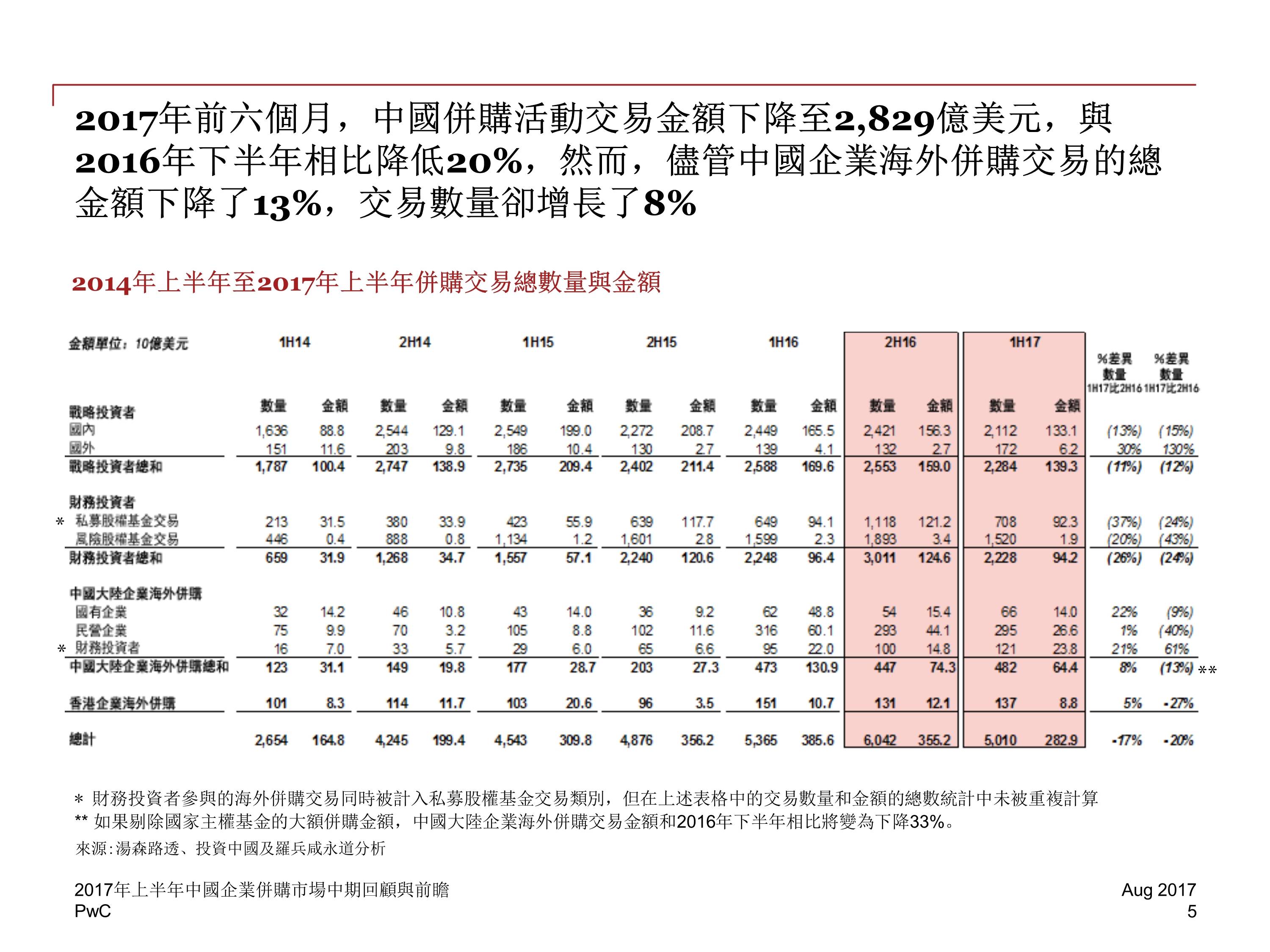 2017 年前六个月,中国并购活动交易金额下降至 2829 亿美元,与 2016 年下半年相比降低 20%,然而,尽管中国企业海外并购交易的总金额下降了 13%,交易数量却增长了 8%。