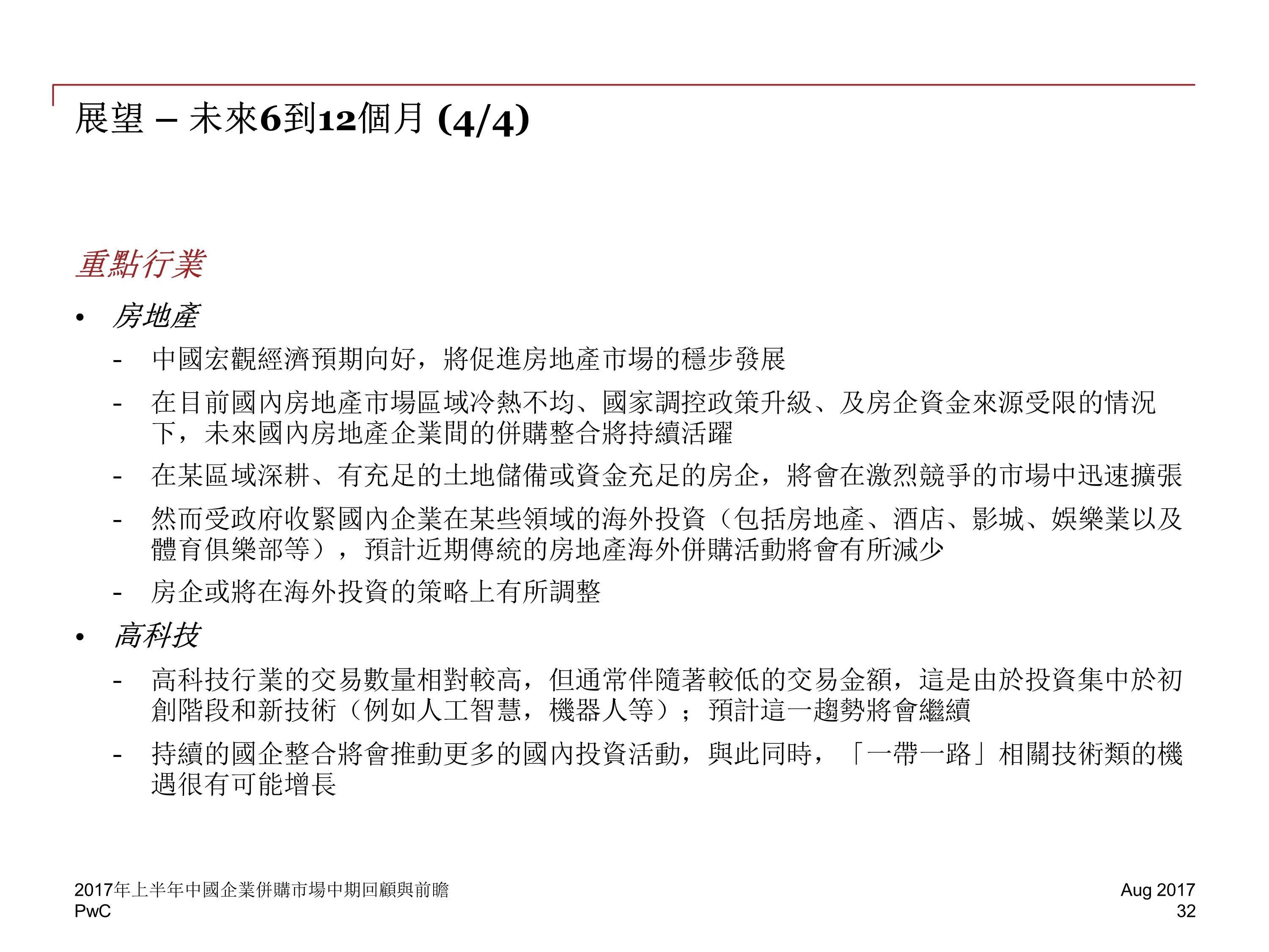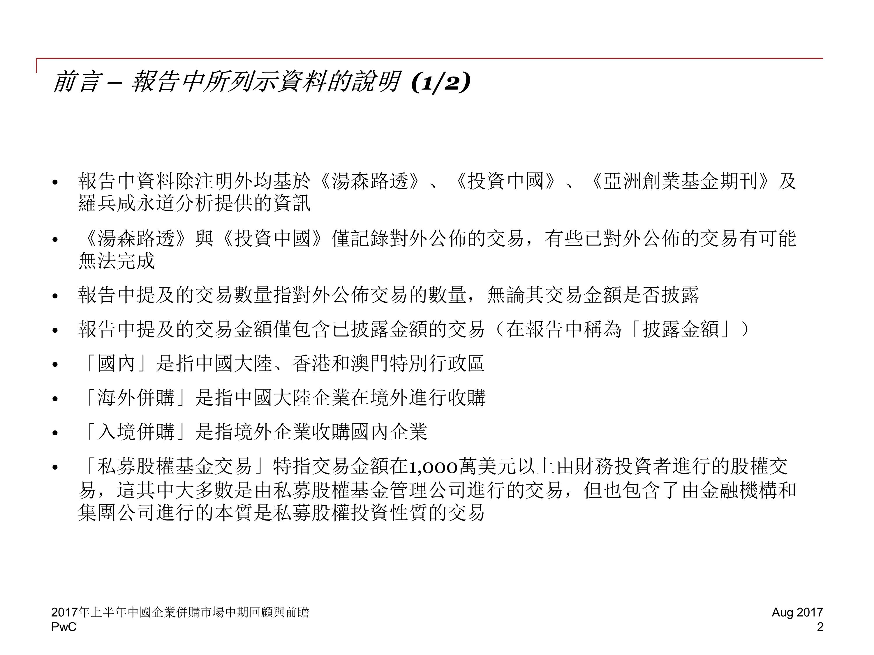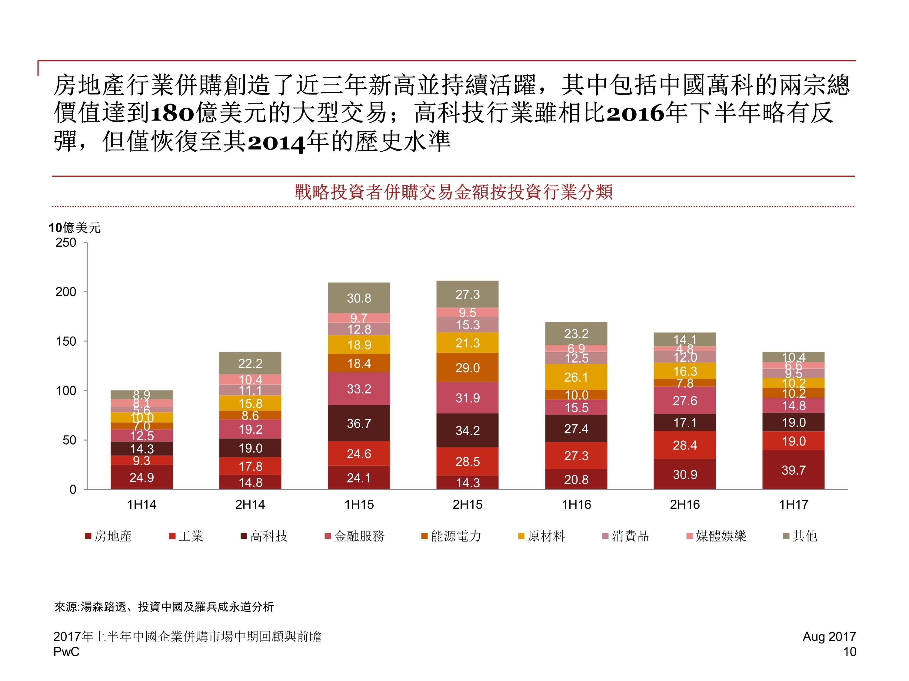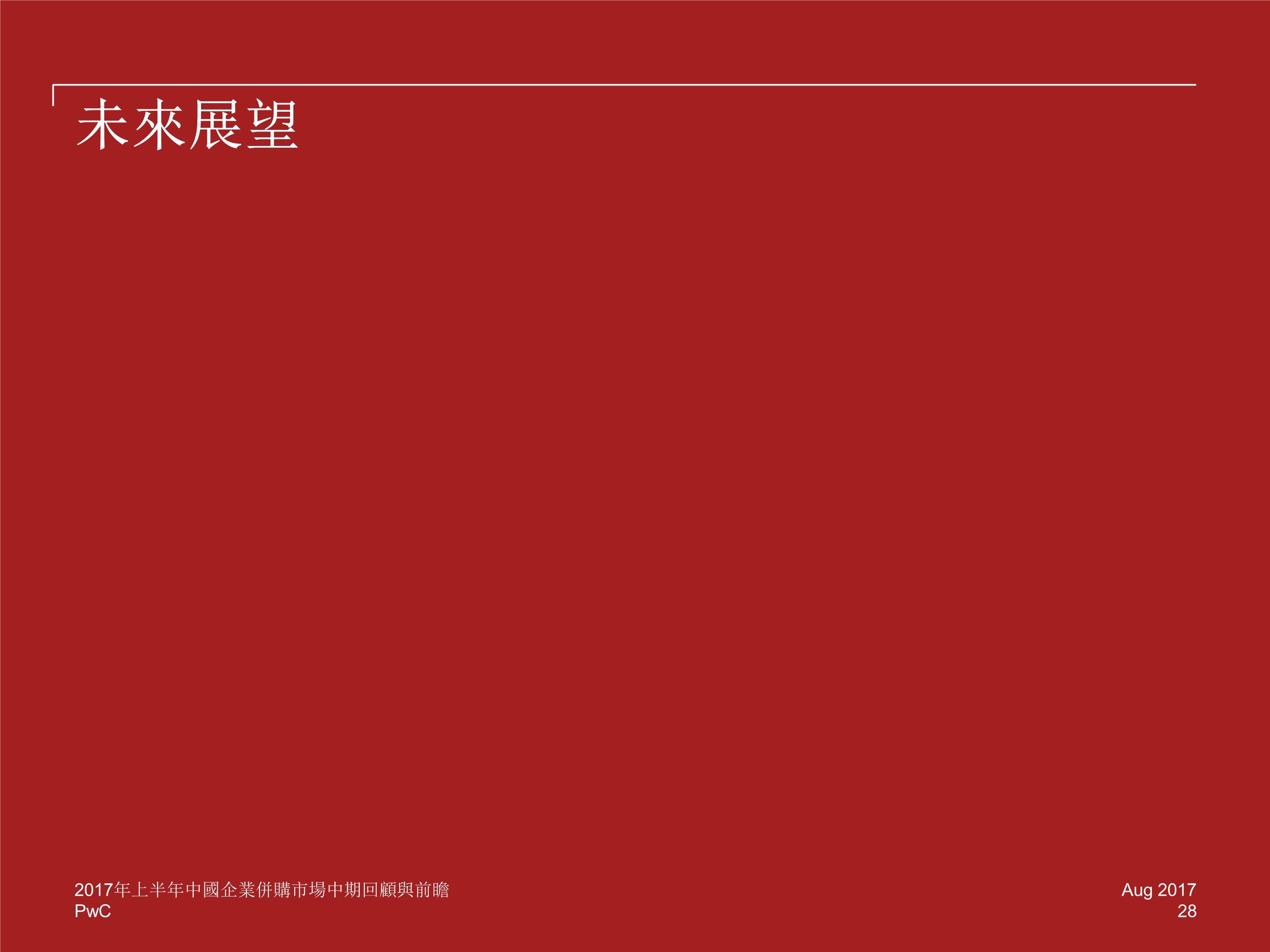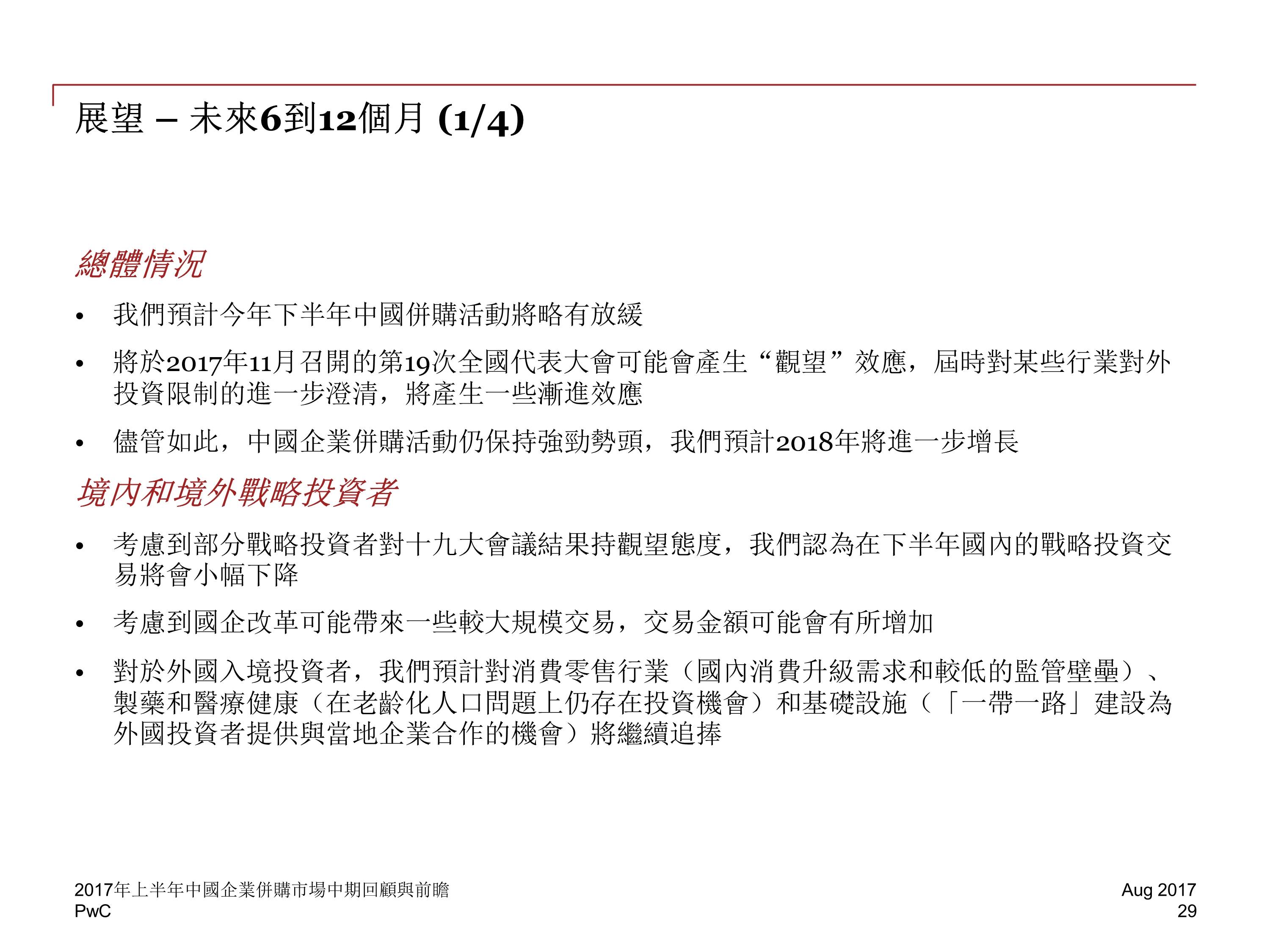 2017 年前六个月,中国并购活动交易金额下降至 2829 亿美元,与 2016 年下半年相比降低 20%,然而,尽管中国企业海外并购交易的总金额下降了 13%,交易数量却增长了 8%。