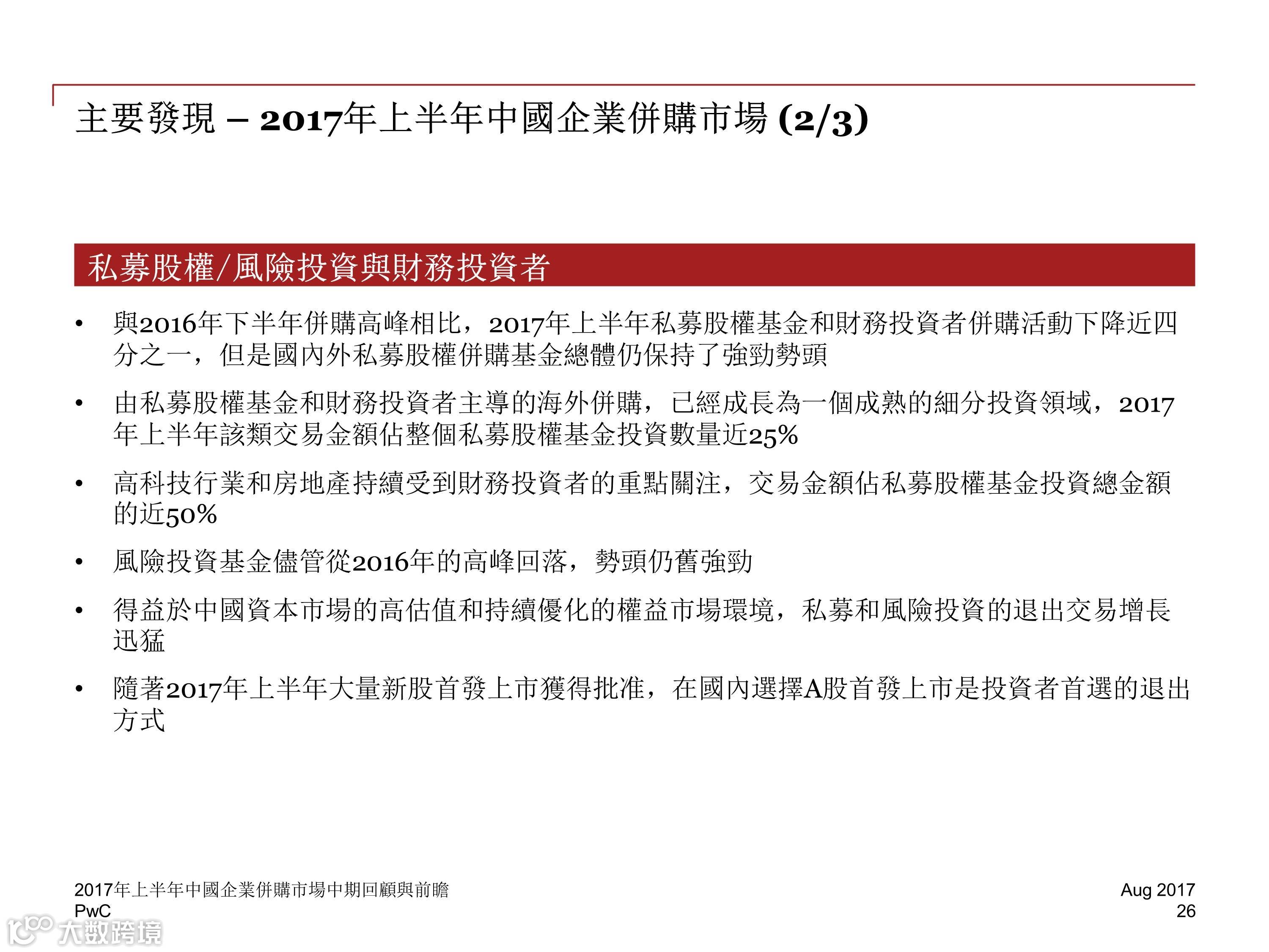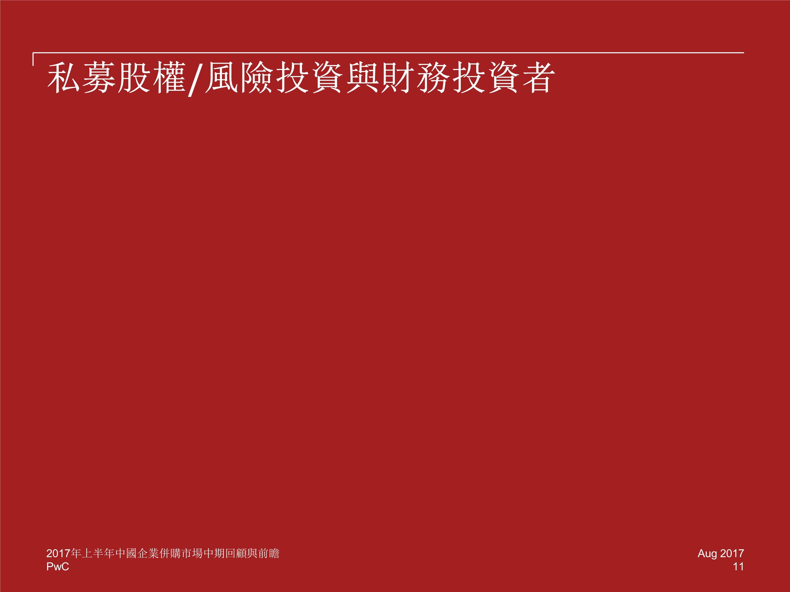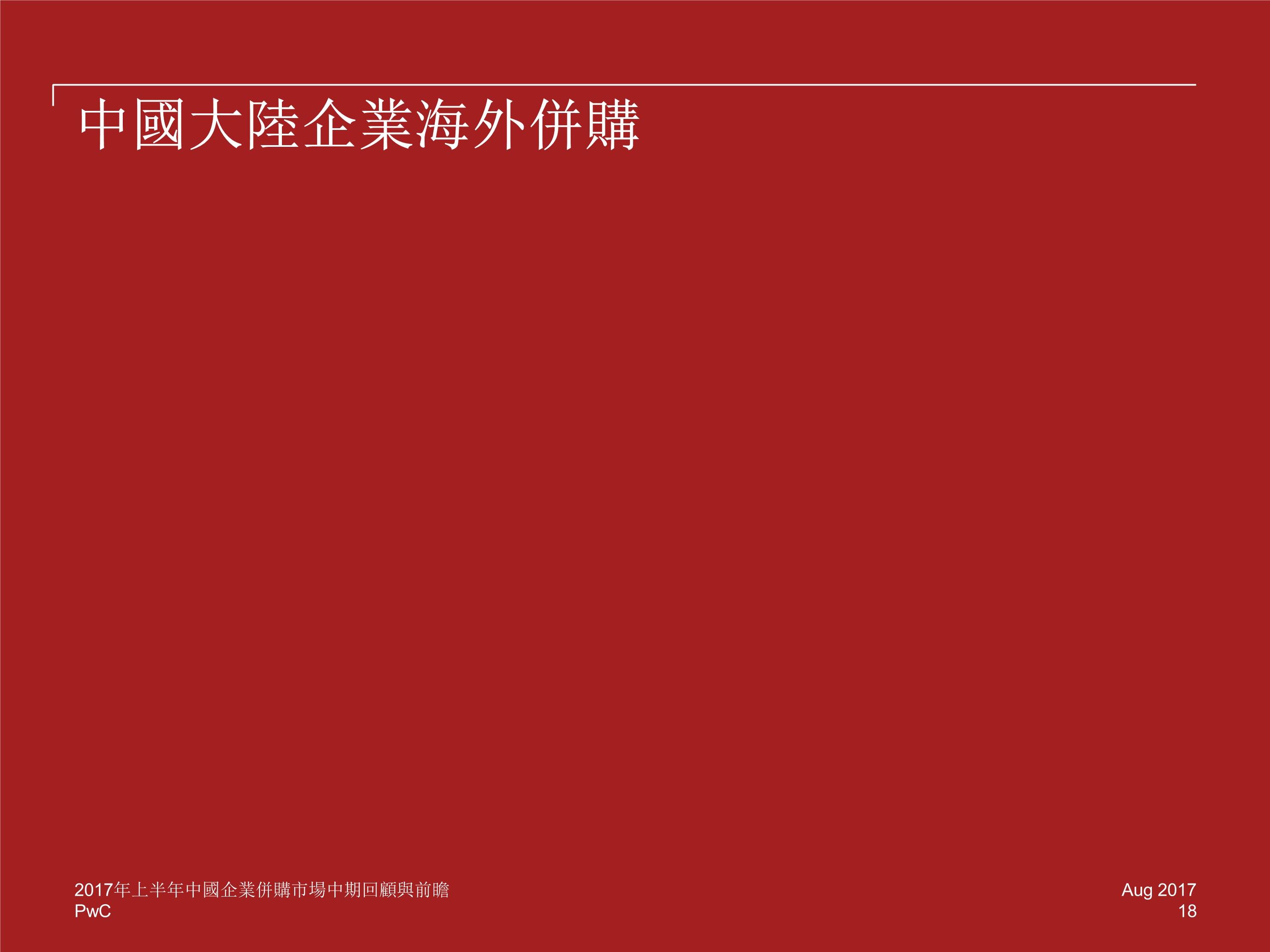 战略投资和财务投资者的并购交易数量同样有所回落,然而,尽管受到诸多限制,海外并购的活跃度(数量)仍在 2017 年上半年环比增加了 8%,并创造出 482 宗的半年交易量新记录。
