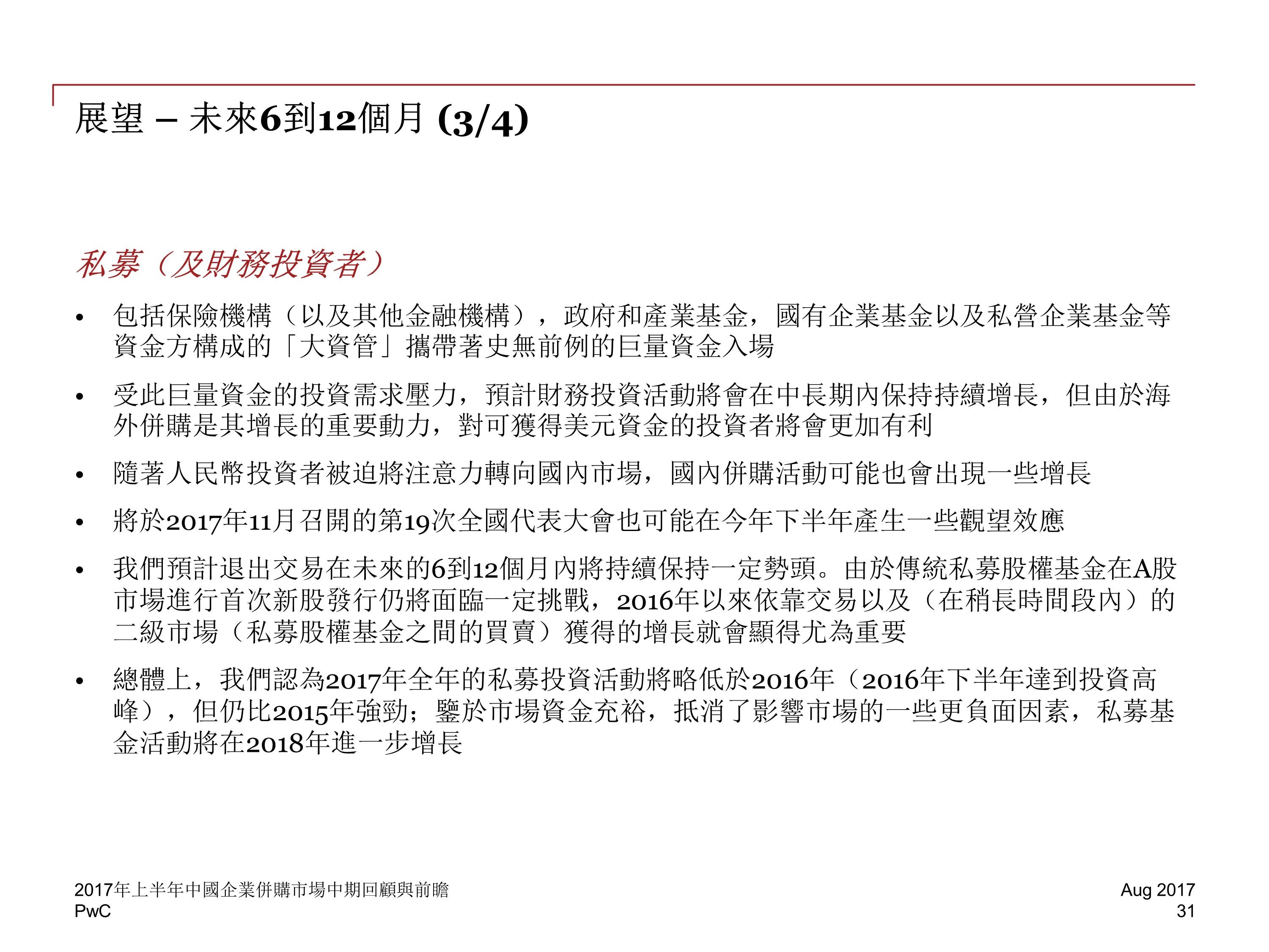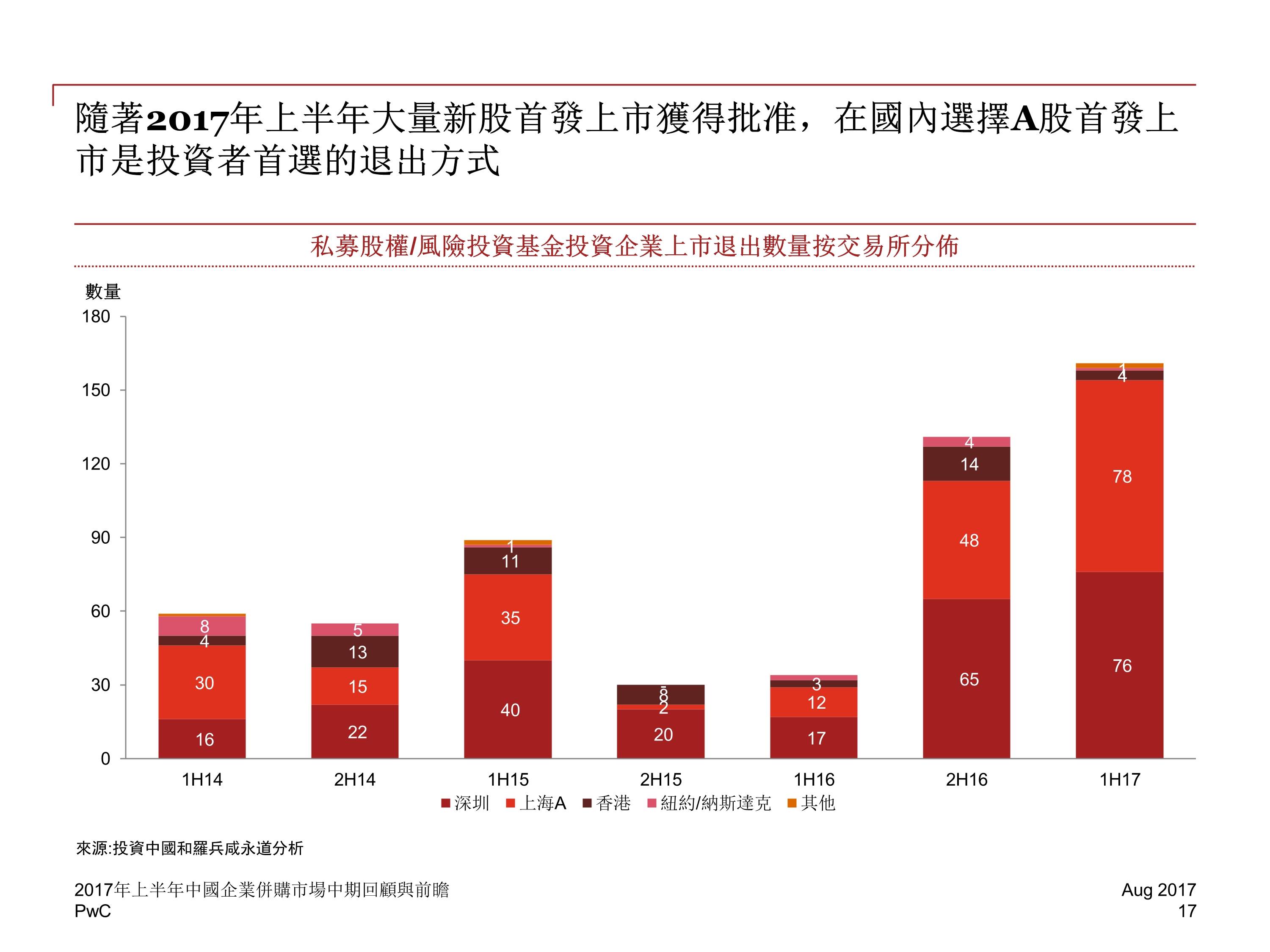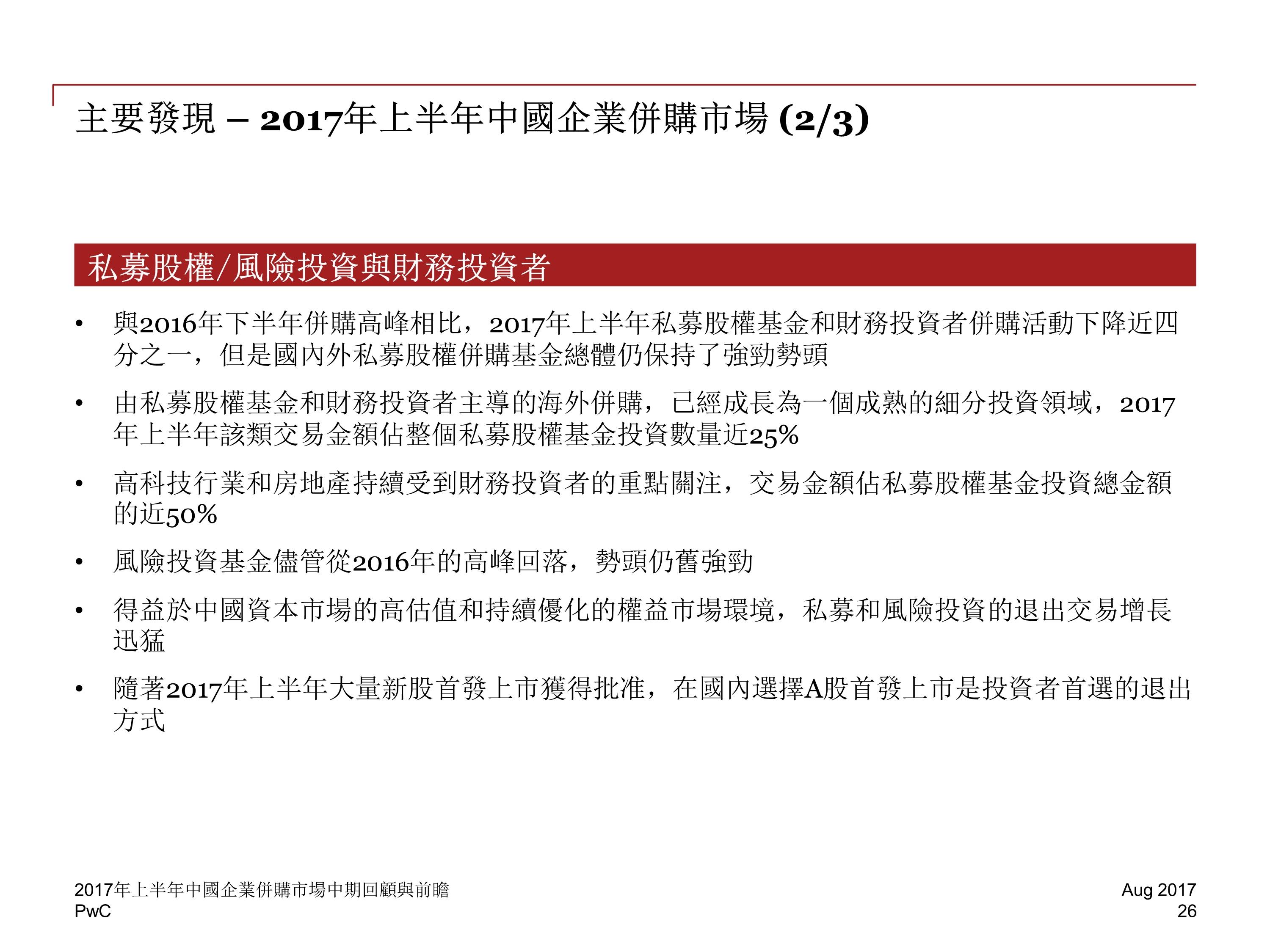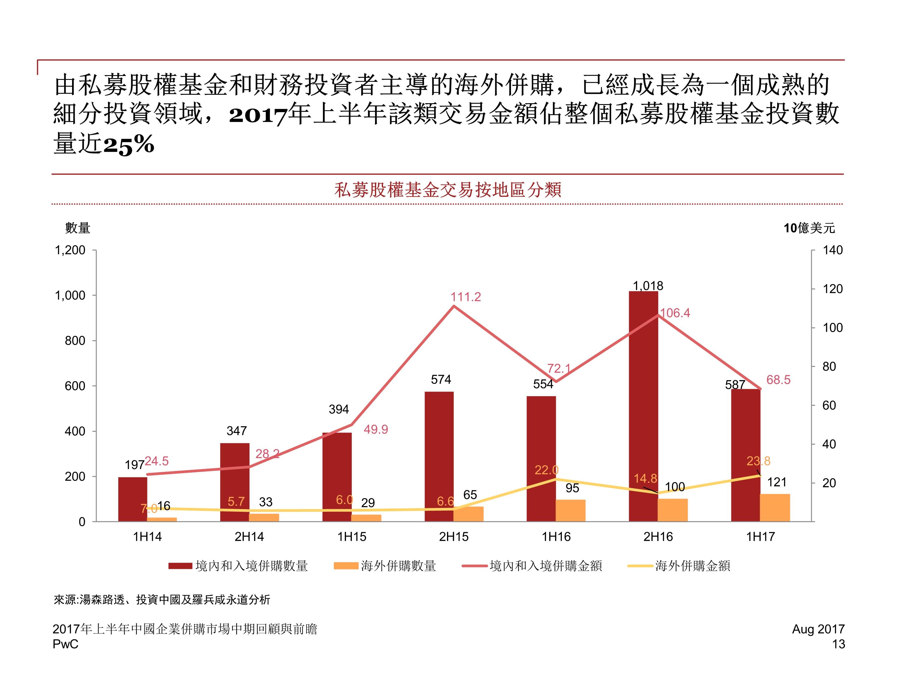 战略投资和财务投资者的并购交易数量同样有所回落,然而,尽管受到诸多限制,海外并购的活跃度(数量)仍在 2017 年上半年环比增加了 8%,并创造出 482 宗的半年交易量新记录。