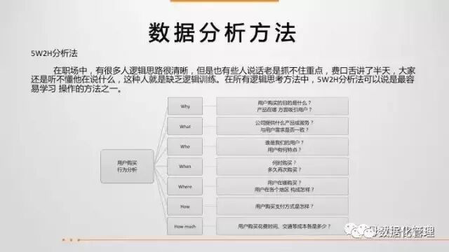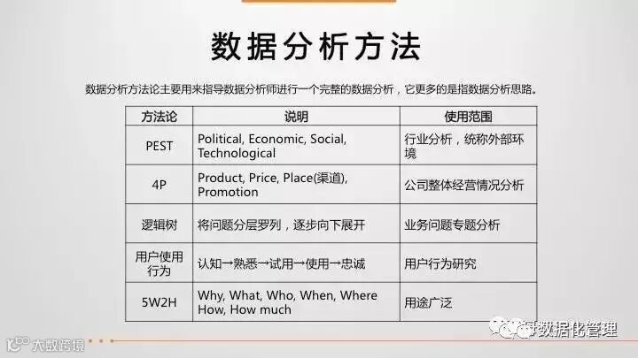 数据分析的方法主要包含以下五种:PEST、4P、逻辑树、用户使用行为、5W2H。