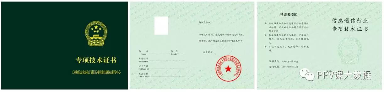 (此证书为CDA协会颁发等级认证证书Level Ⅰ,全国统考,一年两次,此证书为CDA数据分析师唯一认证证书,可以作为企业事业单位选拔和聘用专业人才的任职参考依据。) 【CDA考试安排】 1. 考试时间2017年6月26日、12月24日 2. 考试内容:统计概率基础知识,数据库基础知识,解决简单的数据处理与数据分析。 3. 报名费用:1000元/人。参加CDA系统培训学员费用为600/人。 4. 其他:CDA考试一次不过可申请补考,补考费用为原价一半。证书3年审核一次。 →→→考试报名链接 2、工信部信息通信行业专项技术证书 学生结业之后,颁布结业证书,可自愿办理工信部专项技术证书(数据分析师初级400元/人),证书样式如上: |