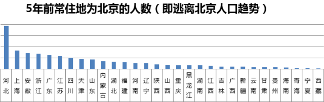 在 2010 年第六次全国普查中,有一栏数据为“全国按现住地和五年前常住地分的人口”,根据这个数据,我们可以推算出“5 年前常住地为北京的人口”,即真正践行了逃离北京的人口趋势。