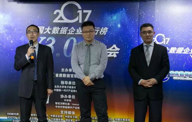 2017《中国大数据企业排行榜》新闻发布会由中华网、北京智优沃孵化器协办,首席数据官联盟发起人葛涵涛主持,联盟发起人刘冬冬致辞,联盟副秘书长石峰对《中国大数据企业排行榜》进行了深度解读。北京大学电子政务研究院副院长杨明刚、中科院计算机研究所博士生导师罗平、中国钢铁集团信息管理部总经理李红、中国黄金珠宝公司信息管理部总经理周韩林、三一重工流程信息化总部战略总监文博武、中华网创新业务总监熊锦华、中关村大数据产业联盟秘书长赵国栋等领导和专家出席了本次新闻发布会,并分别代表中国大数据的产、学、研、用领域阐述了对大数据排行榜的认可、支持和建议。