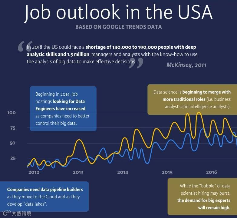 市场对与数据科学方面人才的热情依旧不变。根据 McKinsey 的数据,在 2018 年,美国可能面临 14 万到 19 万具有深度分析技能的人才缺口,以及 150 万能使用专业知识进行大数据分析并做出有效决定的经理和分析师。