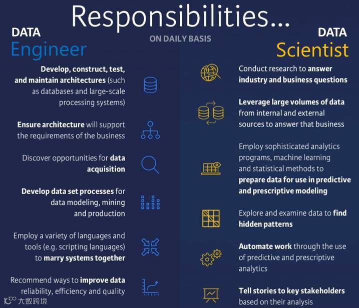 数据工程师的职责主要是开发,构建,测试和维护架构,如数据库和大型处理系统。而数据科学家主要负责清洁,“按摩”和组织数据。