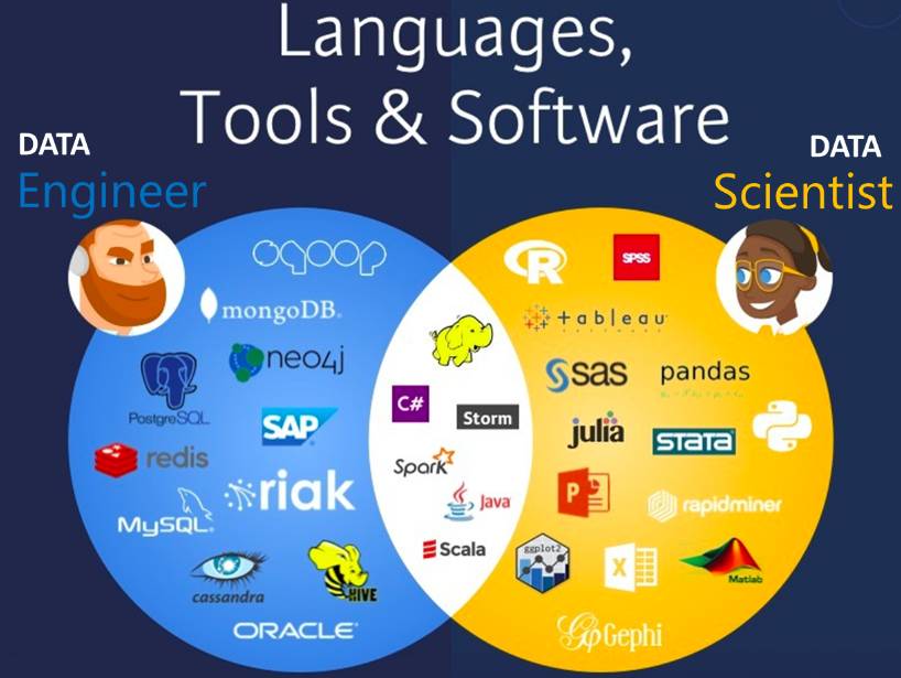 尽管两者使用的工具很大程度上取决于所处的公司环境,但通常数据工程师使用 SAP ,Oracle , Cassandra , MySQL , Redis , Riak , PostgreSQL , MongoDB , neo4j , Hive , Sqoop 等工具。