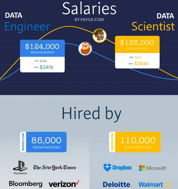 目前招聘数据工程师的公司是 PlayStation , The New York Times , Bloomberg 和 Verizon ,但在过去, Spotify , Facebook 和亚马逊等公司都聘用了数据工程师。另一方面,需要数据科学家的公司有 Dropbox ,微软,德勤和沃尔玛等。