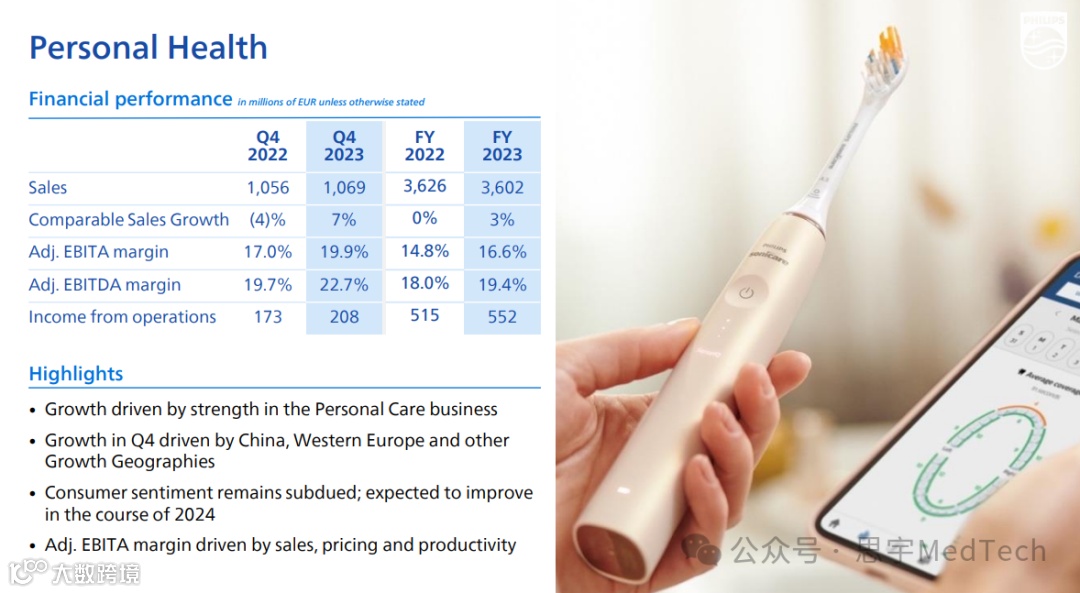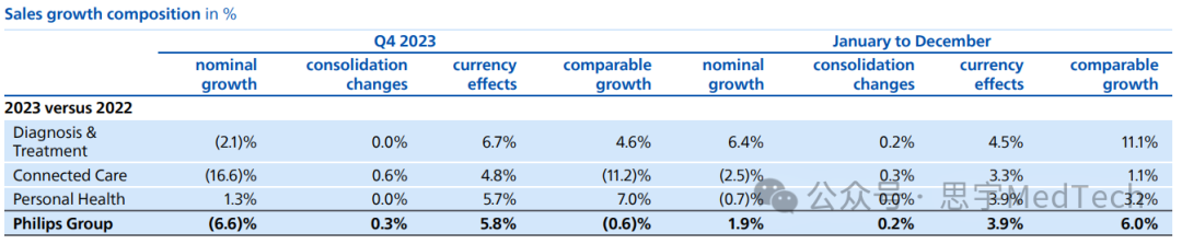 飞利浦的业务主要分为诊断和治疗、互联护理和个人健康三部分,其中诊断和治疗业务增长最为显著,年销售额达88.18亿欧元,可比增长11%,其他两个业务未见明显增长:互联护理(51.38亿欧元,1%)、个人护理(36.02亿欧元,3%); -