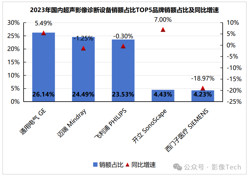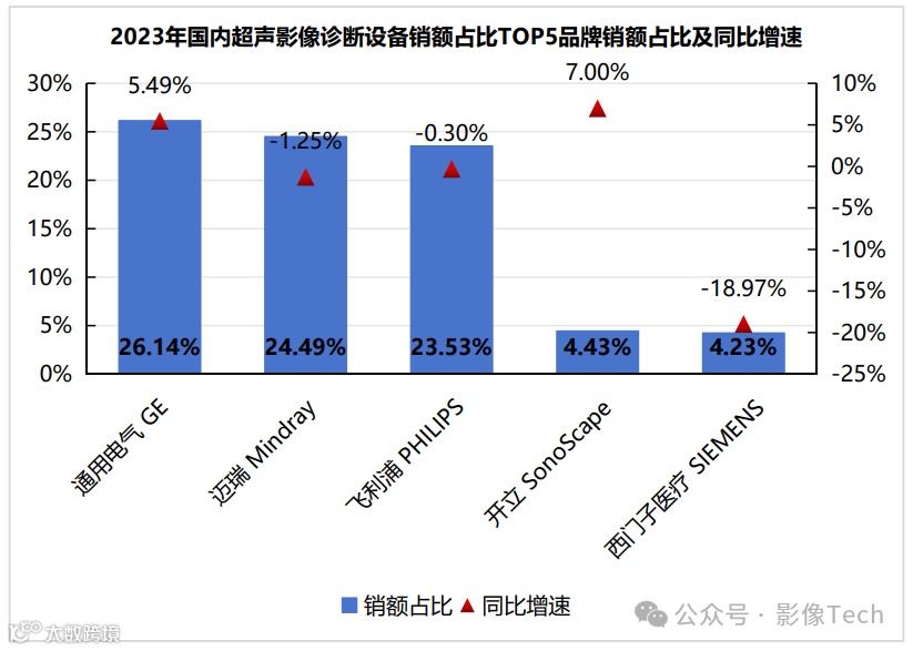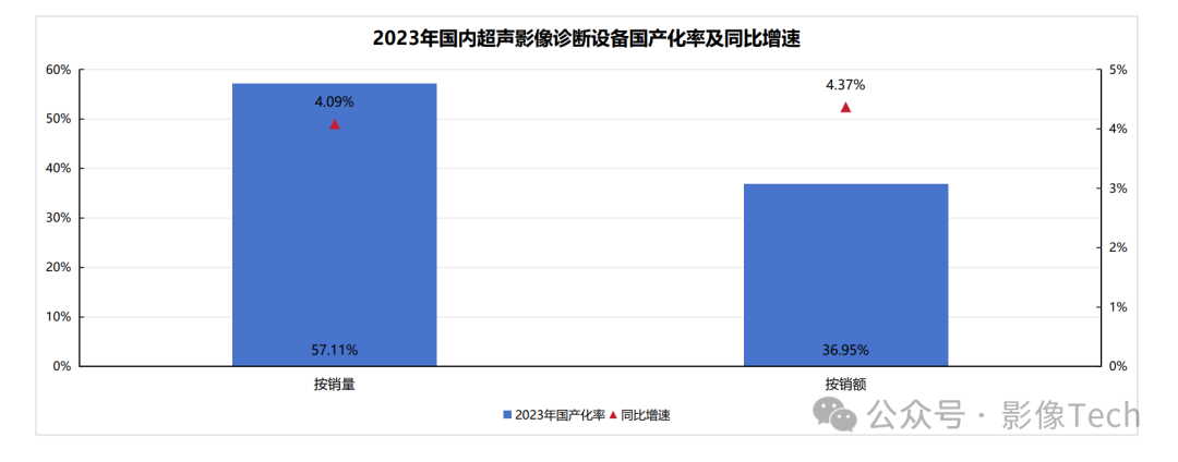 2023年,我国超声影像诊断设备国产化率达到了57.11%,同比增长了4.09%。这一增长不仅展现了国产设备在市场上的竞争力,也反映了国产替代趋势的加强。在销额方面,国产化率达到36.95%,同比增长率为4.37%,这进一步显示了国产设备在提升质量和市场接受度方面所取得的成果。