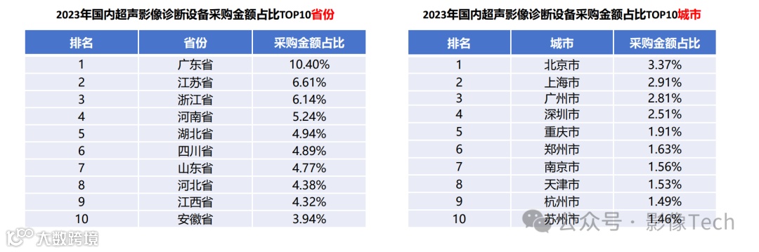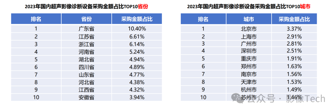 而从城市角度来看,2023年我国超声影像诊断设备新设备采购金额前十城市的占比之和达21.18%,这揭示了超声影像市场在地域上的集中度以及一线城市对高端医疗设备的较高需求。