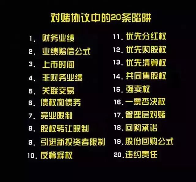 关于“上市时间”的约定即赌的是被投公司在约定时间内能否上市。“上市时间”的约定一般是股份回购的约定,“比如约定好两到三年上市,如果不能上市,就回购我的股份,或者赔一笔钱,通常以回购的方式。但现在对这种方式大家都比较谨慎了,因为通常不是公司大股东能决定的。”