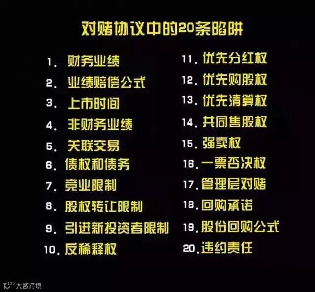 这是对赌协议的核心要义,是指被投公司在约定期间能否实现承诺的财务业绩。因为业绩是估值的直接依据,被投公司想获得高估值,就必须以高业绩作为保障,通常是以“净利润”作为对赌标的。