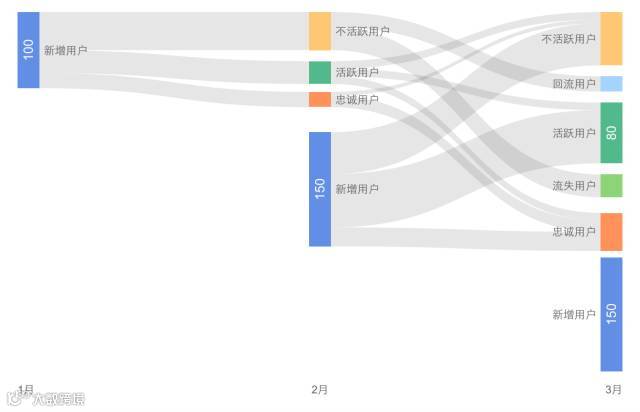 桑基图是最合适的图表(偷懒拿旧图了),上图只是活跃状态的变化。不妨想一下,同样的图表,用来分析用户在产品上的操作路径,比如某个功能模块的使用、退出、跳转,是否能优化产品呢?