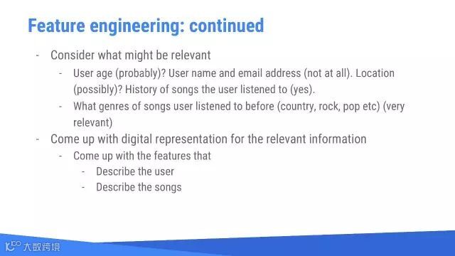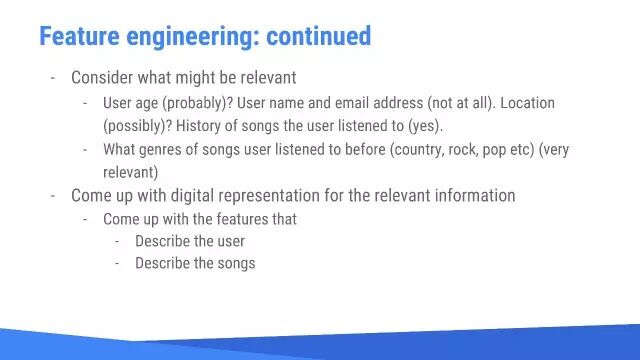 决定如何建模(有许多方法!) .例如,建一个分类模型,给定用户和歌曲,模型将返回用户是否会对这首歌感兴趣的结果。或者我们有一个歌曲列表,把它给模型运行,模型将显示它认为用户可能会喜欢的歌曲。