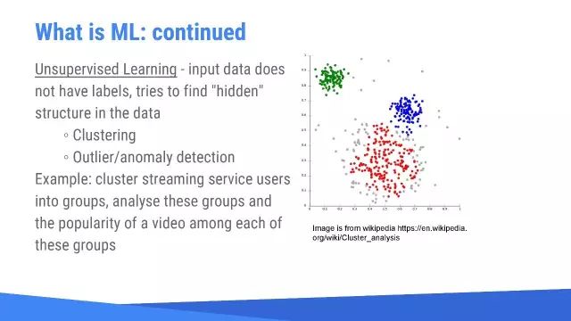 无监督学习:输入数据没有标记,尝试在数据中查找“隐藏的”结构。