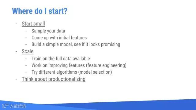 动手实践:选择存储工具(如 Google Cloud,Amazon 等);为存储数据、训练和预测编码;可以使用开源框架(liblinear,Weka,Tensorflow 等)或自己的实现模型;