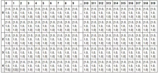 图中只显示了前5行、320列的数据,每个方格代表一个像素点,其中的数据[1.0, 1.0, 1.0]即为颜色。假设用[1.0, 0, 0]表示红色,[0, 1.0, 0]表示绿色,[0, 0, 1.0]表示蓝色,那么如图所示,前面5行的数据则全是白色。