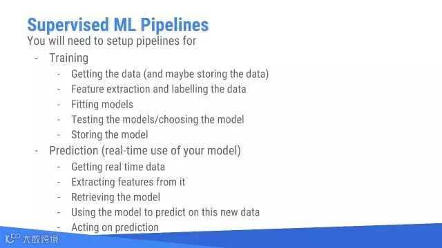 训练:获取数据(可能还需要存储数据);特征提取和数据标记; 拟合模型; 测试模型/选择模型;存储模型