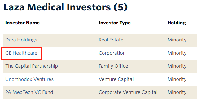 2023年12月,GE医疗参与知名医疗孵化机构Shifamed旗下的Laza Medical的3600万美元(约合人民币2.36亿)A轮融资。据了解,Laza Medical正在开发一种由AI和最先进的机器人技术支持的心脏介入成像解决方案。