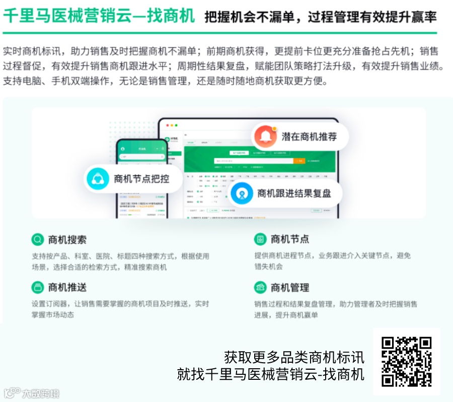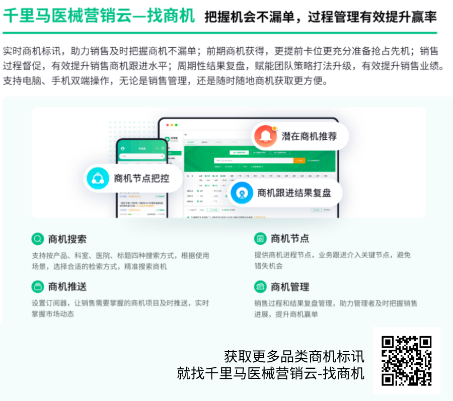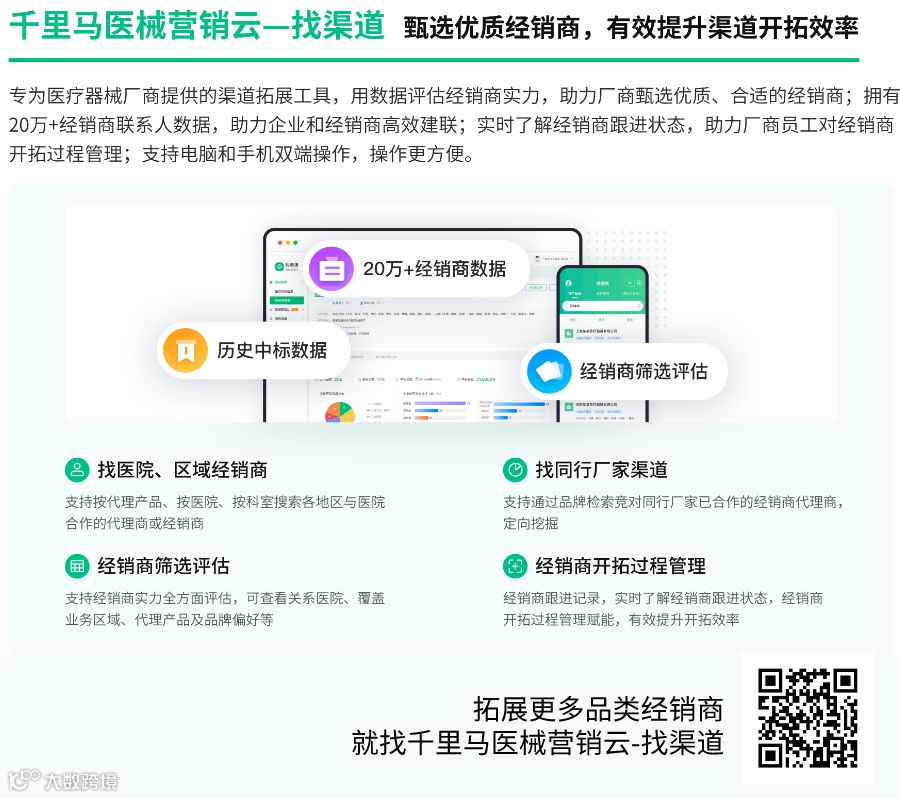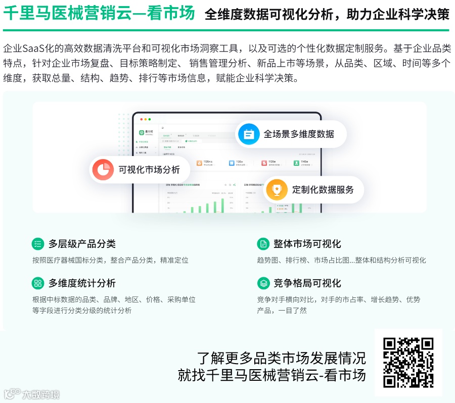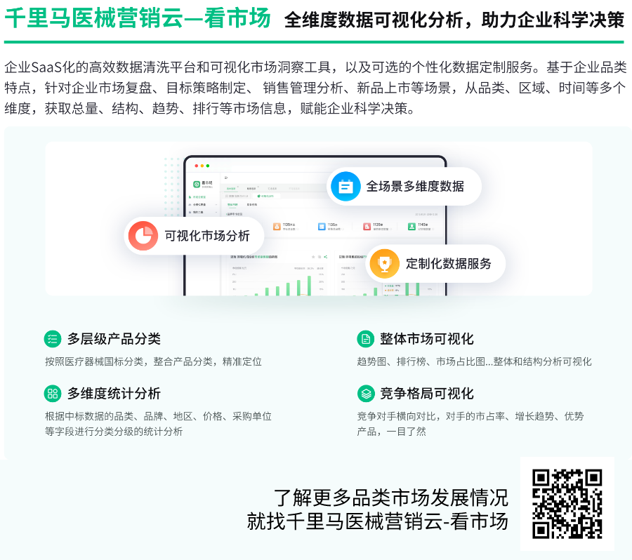 1、本文数据来源于千里马医械营销云,不包含非公开中标数据,由“售械者”新媒体整理。千里马医械营销云是对医疗器械厂商市场营销进行赋能的数字化产品线,依托千里马招标网全量招中标数据和医疗行业专业数据,通过对经销商渠道、商机线索和多维度企业商情的挖掘和分析,服务于市场分析、渠道拓展、商机开发、销售管理等工作,助力医疗器械企业数字化、体系化营销。