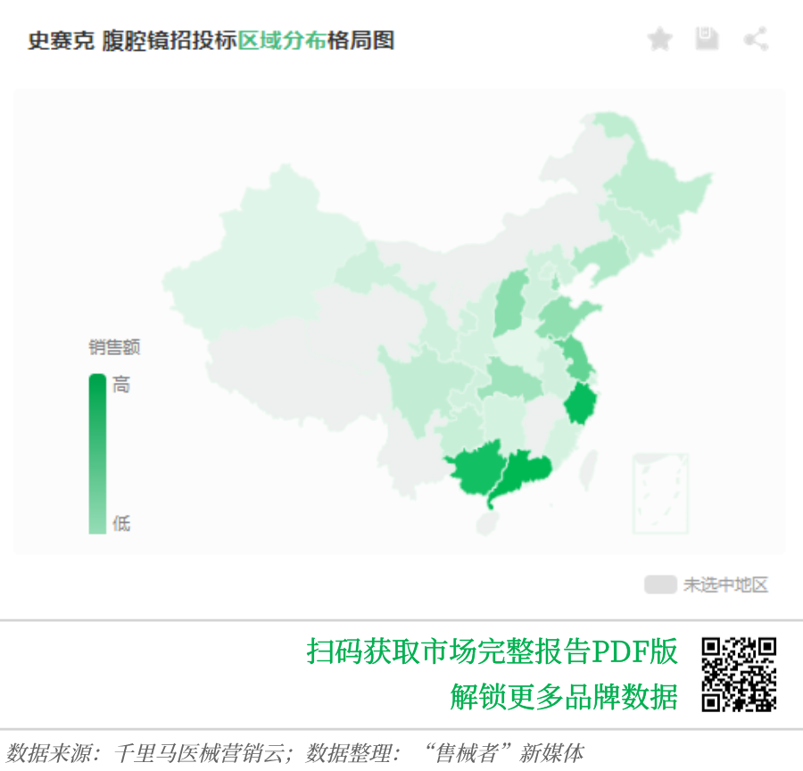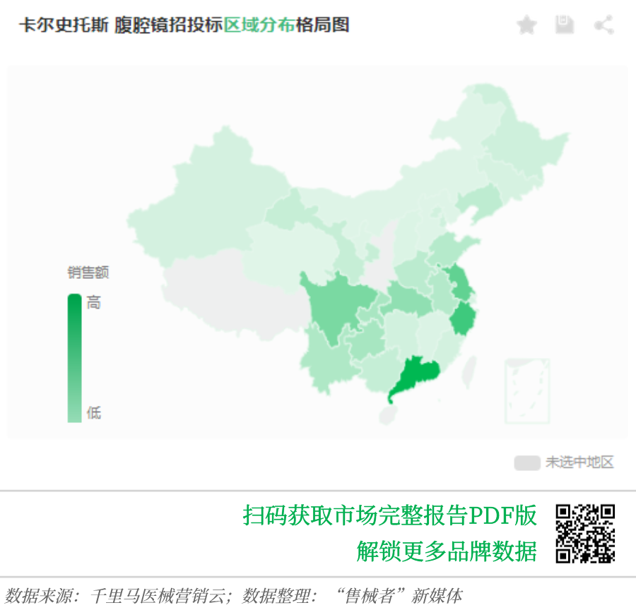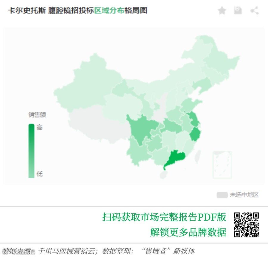 据千里马医械营销云,卡尔史托斯2023年在腹腔镜这个品类:在广东省、浙江省的业绩表现突出;此外,江苏省、四川省也是其销售额较大的省份。