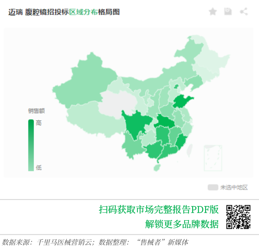 据千里马医械营销云,迈瑞2023年在腹腔镜这个品类:在湖北省和山东省的表现相对强势,排在其后的是四川省和福建省。
