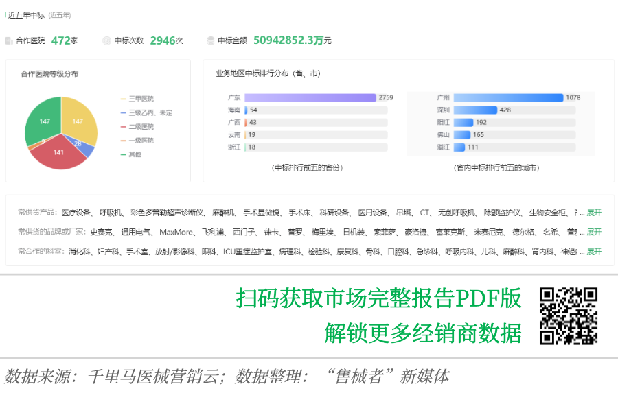 在广东省,销售额排名第一的经销商是国药集团广东省医疗器械有限公司,该企业目前合作过472家医院,中标次数为2946次,核心业务地区主要在广东、广西、海南、云南、浙江等省份。公司主营呼吸机、彩色多普勒超声诊断仪、麻醉机、手术显微镜等产品,常供货的品牌厂家有史赛克、通用电气、MaxMore、飞利浦等。