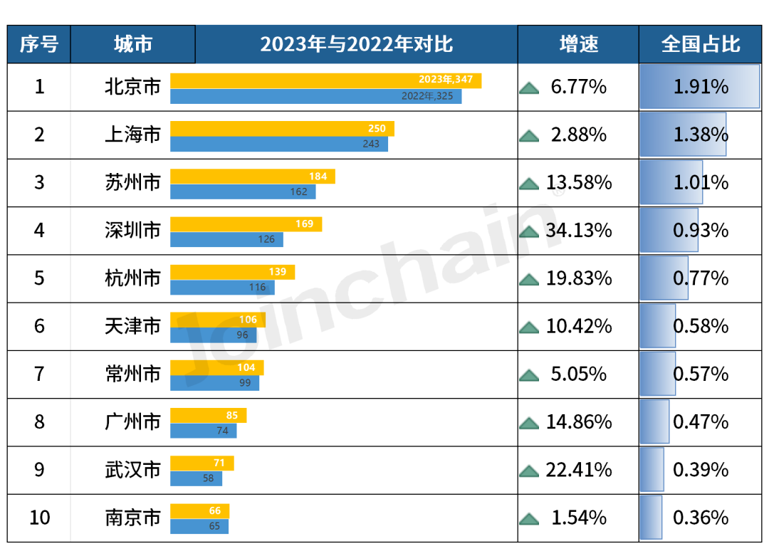 2023年可生产Ⅱ类产品企业存量排名前三的城市分别为深圳市(1038家)、北京市(698家)和上海市(607家);可生产Ⅱ类产品生产企业数量前十的城市中,除上海市外,其余城市均呈正增长,而上海市则较2022年下降了1.78%,可生产Ⅱ类产品企业减少11家。