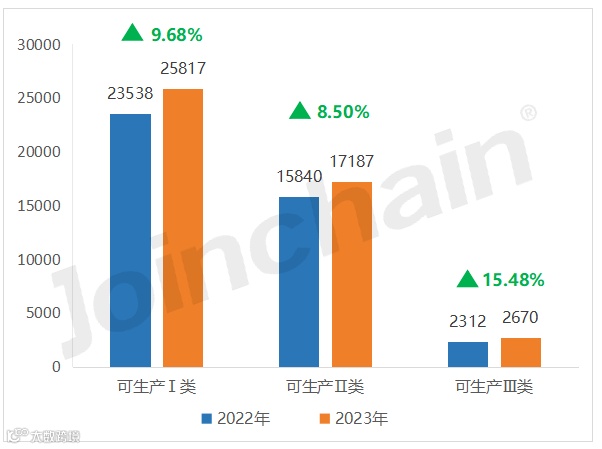 其中,可生产Ⅰ类产品的企业25817家,较2022年底增长9.68%。可生产Ⅱ类产品的企业17187家,可生产Ⅲ类产品的企业2670家,分别增长8.50%、15.48%。