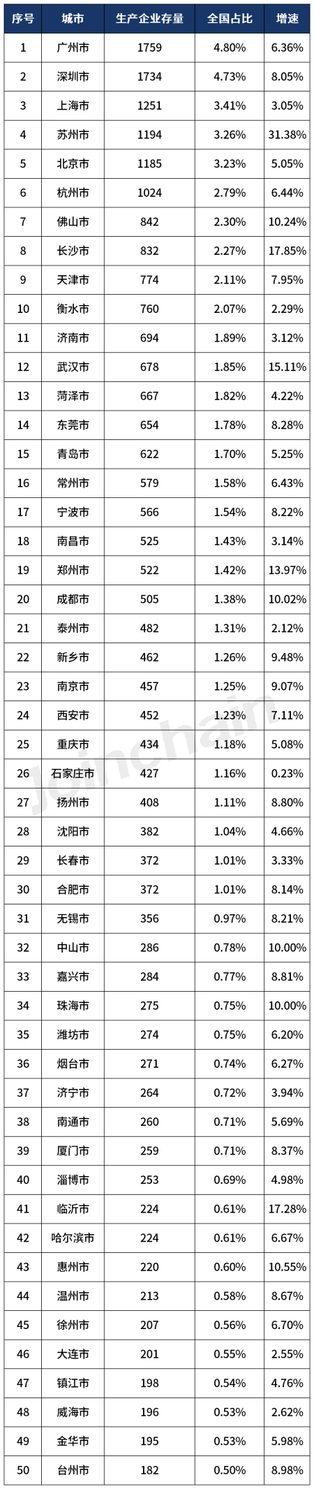 从城市分布来看,2023年全国医疗器械生产企业数量排名第一的城市是广州市,生产企业数量为1759家,全国占比4.80%;深圳市紧随其后,生产企业数量为1734家,全国占比4.73%;排名第三的是上海市是1251家,全国占比3.41%。