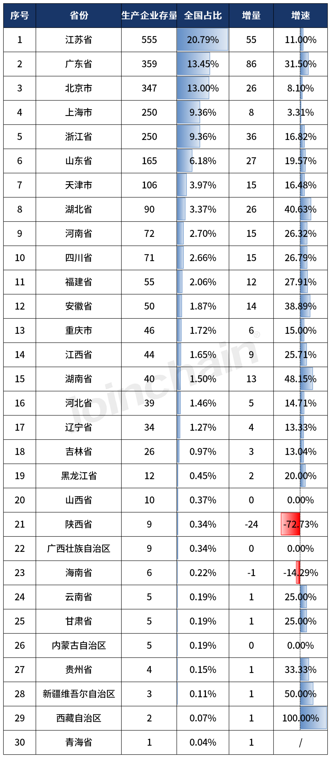 截至2023年12月31日,江苏省可生产Ⅲ类企业数量以555家位居全国第一,占比20.79%;广东省、北京市分别以359家、347家排名第二、第三,占比分别为13.45%、13.00%;从增速看,排名前三的省份分别为西藏自治区(100%)、新疆维吾尔自治区(50%)和湖南省(48.15%)。陕西省和海南省呈负增长,其中陕西省下降最明显,较2022年底减少24家。