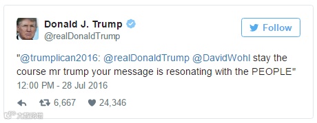 当川普的安卓手机转推时,习惯用双引号引用这整句话。