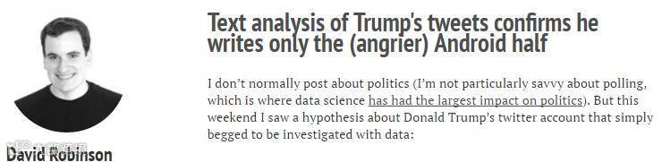 本着科学严谨的态度,程序员小哥决定让数据说话,于是做了程序,抓取分析了川普发过的推,终于发现了一些模式。并且通过统计,图表,最终他基本确定,川普的推特并不是他一个人写的。