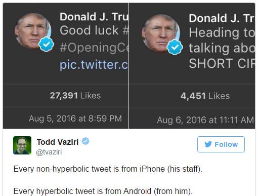 如果就像川普采访中所说他使用的手机是三星 Galaxy ,我们可以确信用安卓发推的是川普本人,用 iPhone 发的大概是他的团队助理。