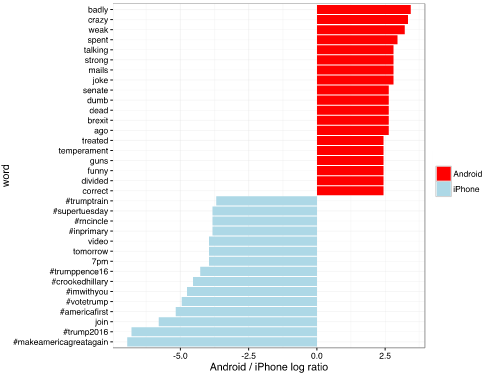 在对比安卓和 iPhone 用词区别时,David 用到了他和 Julia Silge 一起编写的 tidytext 包。