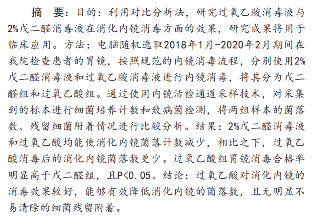 戊二醛和过氧乙酸既可以作为内镜消毒的消毒剂也可以作为灭菌剂,有实验利用对比分析法,研究过氧乙酸消毒液与2%戊二醛消毒液在消化内镜消毒方面的效果: