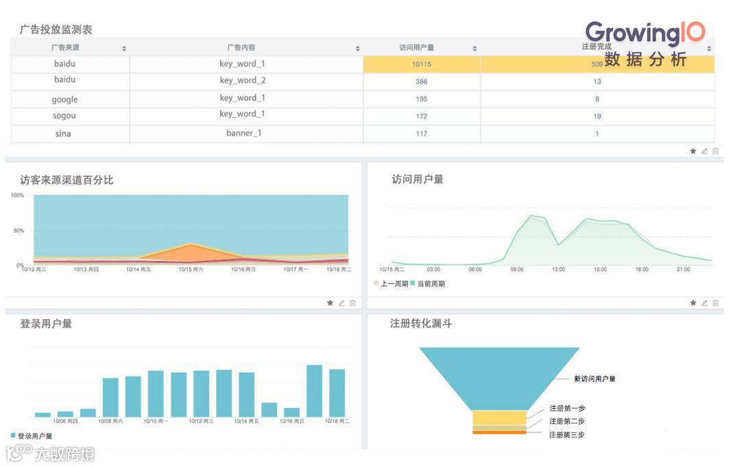 例如SEM主管根据工作需要搭建数据看板,将广告投放(表格)、访客来源(百分比堆积图)、访问用户量(线图)、登录用户量(柱状图)和注册转化率(漏斗)等重要数据集中在一个看板中。数据看板能帮助我们以合适的方式展示数据,集中精力做好业务决策。