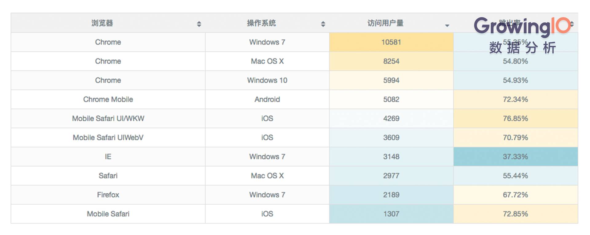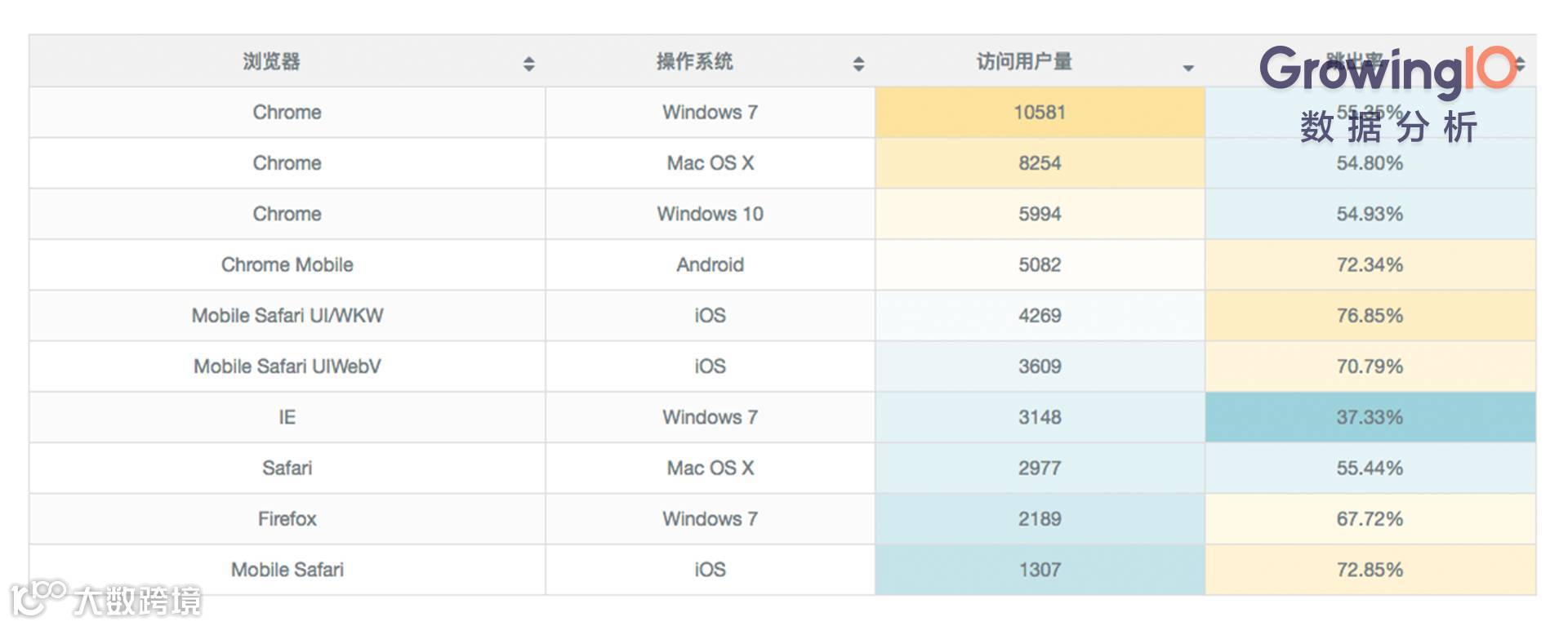 通过表格不难发现,移动端访问用户占了非常大的比例,但是跳出率非常高。这样的表格数据启示我们有必要优化移动端产品,提升整体访问深度。
