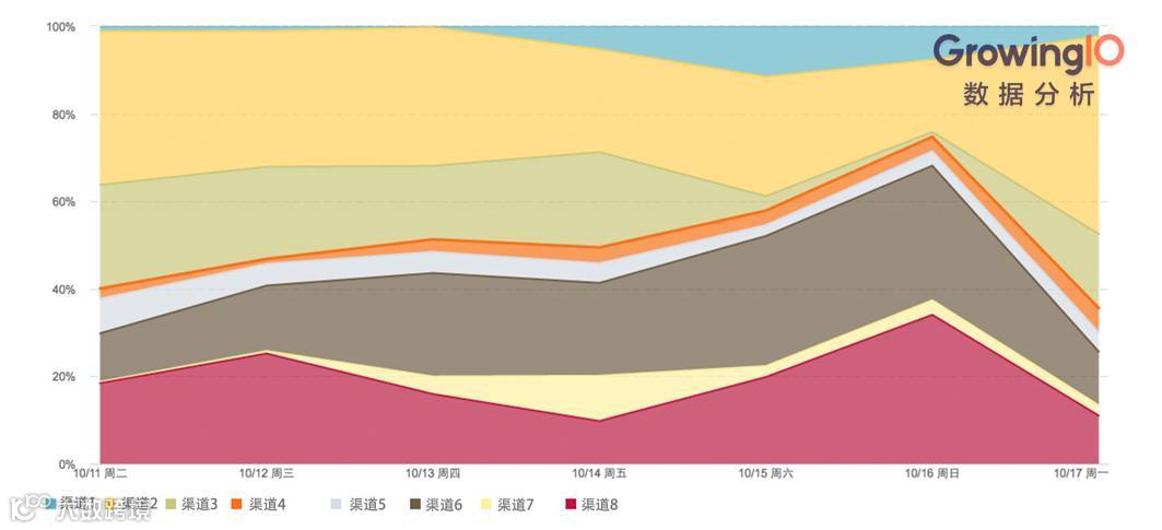 上方的「环形图」显示了某节点访问用户来源渠道比例,而下方的「百分比堆积图」则动态显示了不同渠道比例的变化趋势,市场或者运营人员可以据此动态优化我们的资源投放。